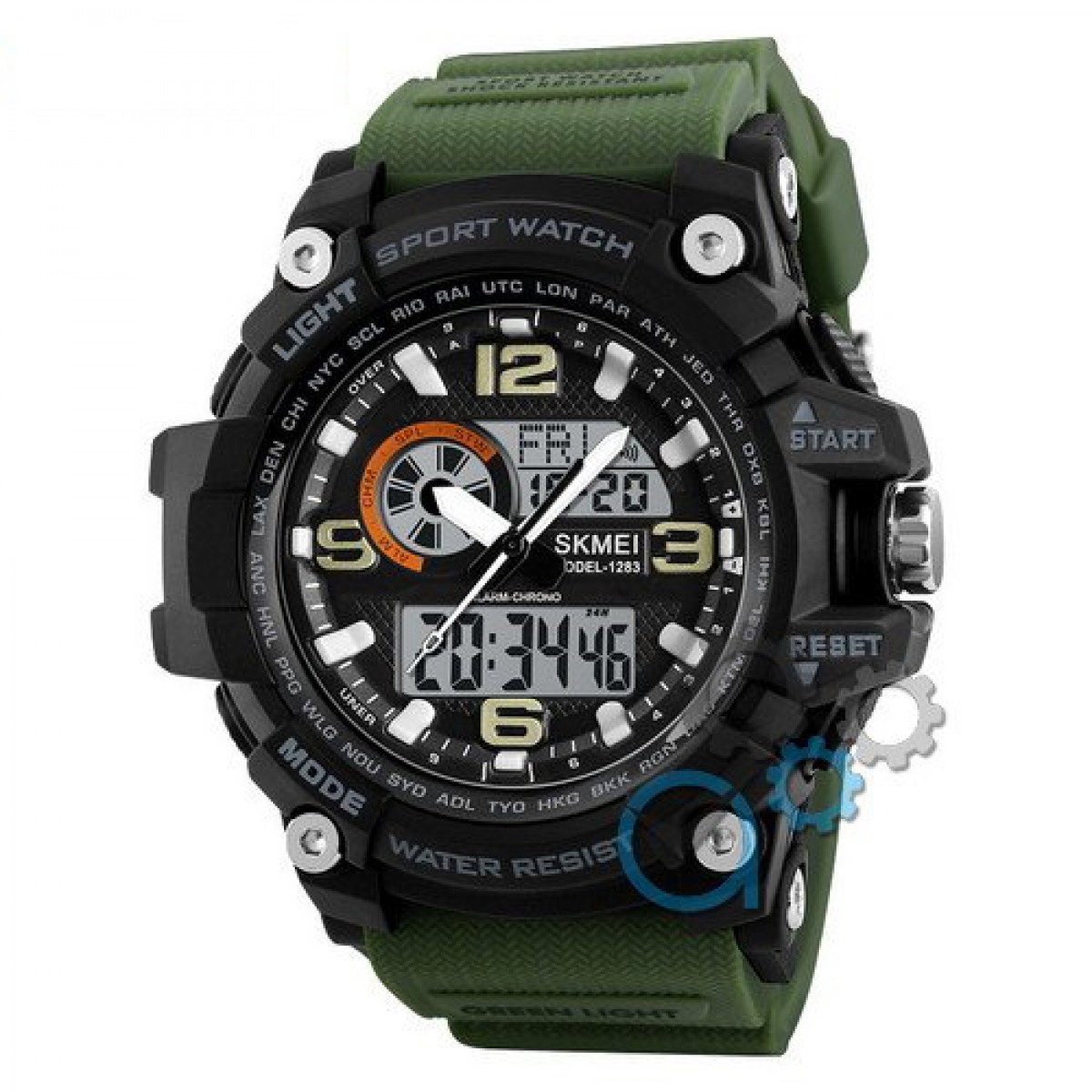 Високоякісне полікарбонатне скло захищає його від подряпин, а стильний чорний корпус у поєднанні з зеленим ремінцем надає йому армійського вигляду. Годинник має компактні розміри (55 х 54 мм) та товщину 17 мм, що робить його ідеальним вибором для активного способу життя.