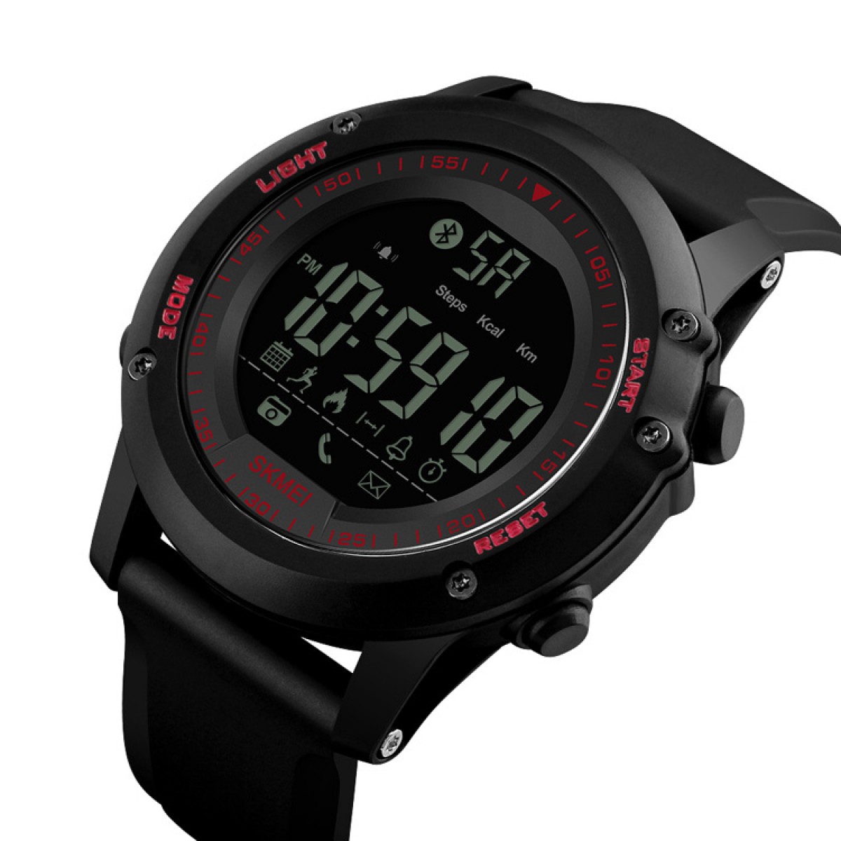 Цей спортивний електронний годинник виготовлений з полімерного корпусу червоного кольору та має поліуретановий ремінець чорного відтінку. Водонепроникність до 50 метрів робить його ідеальним вибором для активних людей. Годинник обладнаний різноманітними функціями, такими як будильник, підтримка Bluetooth, таймер, другий часовий пояс, лічильник калорій та секундомір.