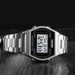 Прямокутний корпус сріблястого кольору вміщує електронний циферблат з індикацією годин, хвилин, секунд, дня тижня, місяця та числа. Годинники оснащені функціями будильника, календаря та секундоміра.