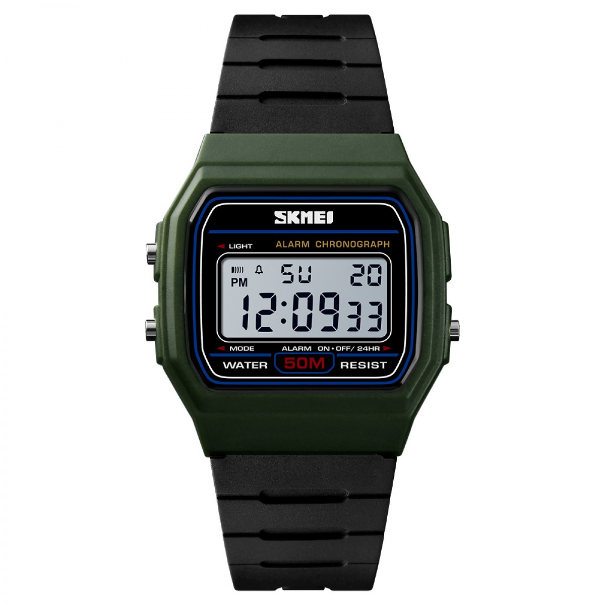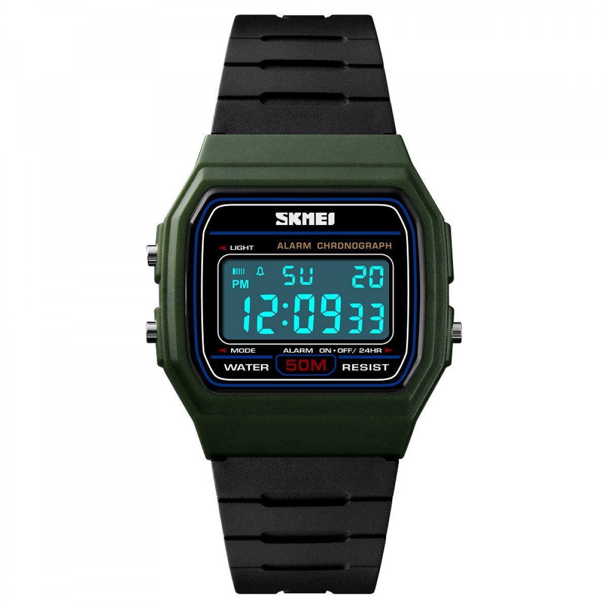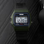 Годинник Skmei 1412AG Army Green - це стильний і функціональний аксесуар, який підходить як для чоловіків, так і для жінок. Його прямокутний корпус виготовлений з полімерного матеріалу та має зелений колір, а ремінець з каучуку забезпечує комфортне носіння. Годинник водонепроникний на глибині до 50 метрів, що робить його ідеальним для активних занять. Електронний циферблат оснащений арабськими цифрами, а електролюмінесцентне підсвічування дозволяє зручно зчитувати час у темряві.