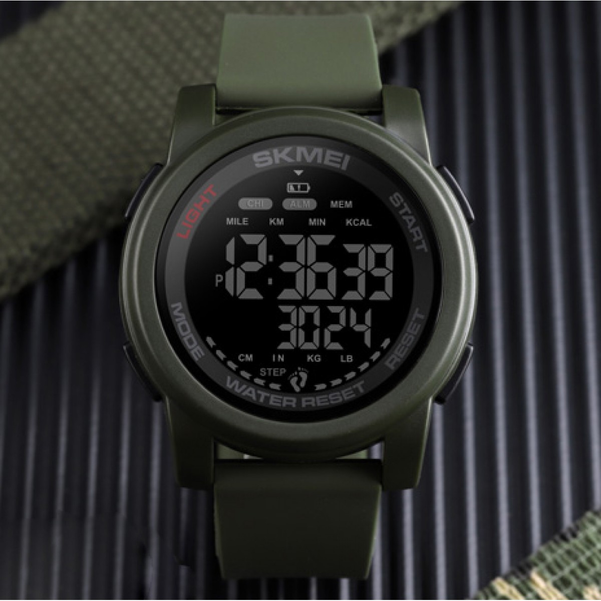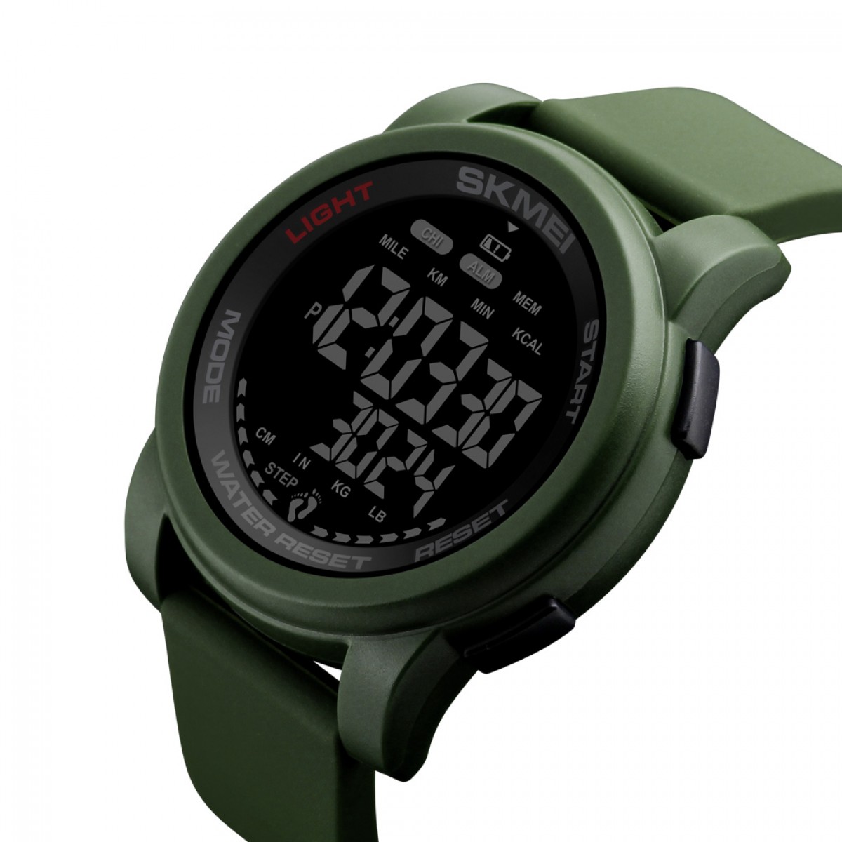 Годинник Skmei 1469AGBK Military-Black поєднує в собі стиль та функціональність. Водонепроникний до 50 м, цей електронний годинник зі спортивним і casual дизайном призначений для чоловіків. Корпус виконаний з полімеру та ABS пластику, а ремінець з силікону, що забезпечує зручність у носінні. Діаметр корпусу складає 50 мм, а товщина - 15 мм. Годинник оснащено електролюмінесцентним підсвічуванням, що дозволяє легко читати час у темряві. Він має безліч корисних функцій: будильник, лічильник калорій, секундомір, крокомір та календар. Індикація включає години, хвилини, секунди, день тижня та число. Довжина ремінця - 26,5 см, ширина - 22 мм, а вага годинника складає 61 г. Годинник має класичну застібку і представлений у зеленому кольорі. Гарантія на виробник становить 12 місяців. Вироблено в Китаї.