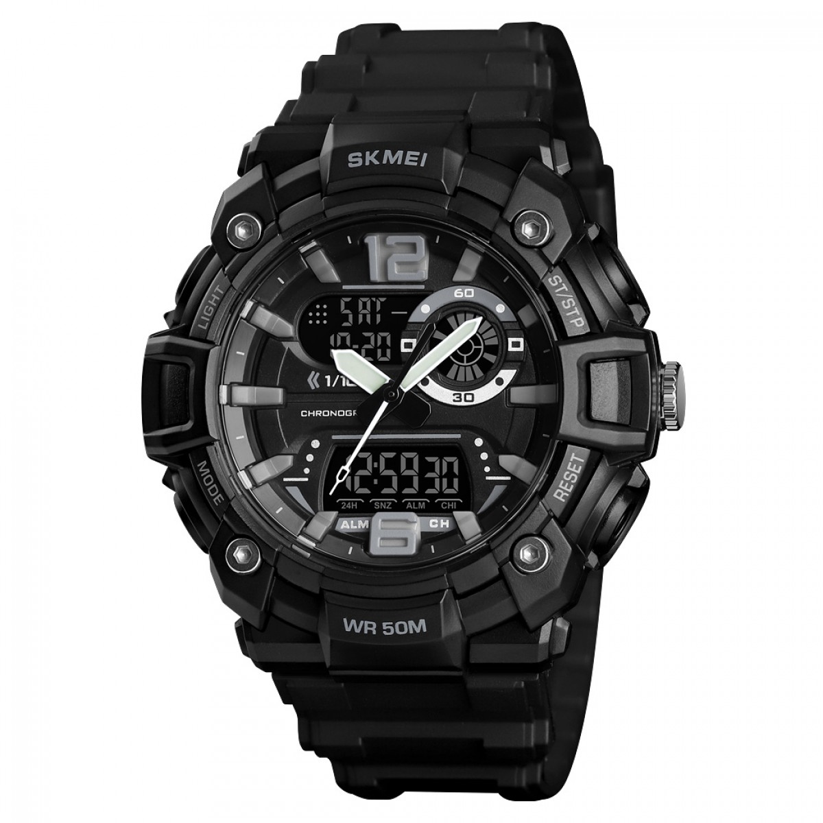 Годинник Skmei 1529BK Black – це стильний та функціональний аксесуар для чоловіків, створений у спортивному та армійському стилях. Корпус виготовлений з міцного полімеру, а ремінець – з надійного каучуку, обидва в елегантному чорному кольорі. Годинник має водонепроникність до 50 метрів, що робить його ідеальним вибором для активного способу життя.