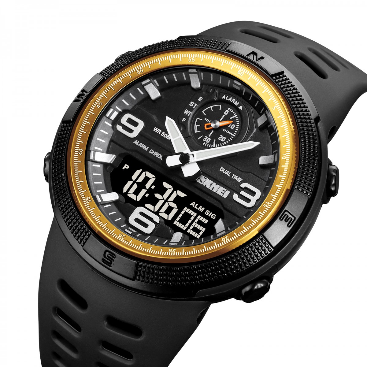 Чоловічий спортивний дизайн з круглою формою корпусу у чорному та жовтому кольорах створює сучасний вигляд. Годинники оснащені кварцовим механізмом та стрілочно-електронним циферблатом, а також функціями будильника, календаря, другого часового поясу та секундоміра.