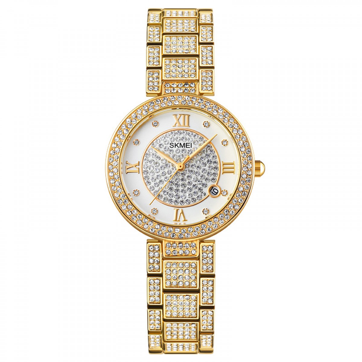 Годинник Skmei 1739GD Gold — стильний жіночий аксесуар, що поєднує у собі класичний дизайн і сучасні функції. Корпус виготовлений з металу зі золотистим відтінком, а ремінець з нержавіючої сталі забезпечує комфорт та надійність. Завдяки водонепроникності до 30 метрів і кварцовому механізму, цей годинник ідеальний для щоденного використання. Циферблат, з арабськими та римськими цифрами, доповнений календарем та індикацією годин, хвилин і секунд. Годинник має діаметр корпусу 34 мм і товщину 10 мм. Гарантія на товар становить 12 місяців.