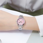 Цей жіночий годинник має класичний круглий корпус, виготовлений з металу, та мінеральне скло, яке забезпечує високу зносостійкість. Його кварцовий механізм дарує точність у вимірюванні часу, а підсвічування на циферблаті дозволяє легко зчитувати час у темряві.