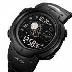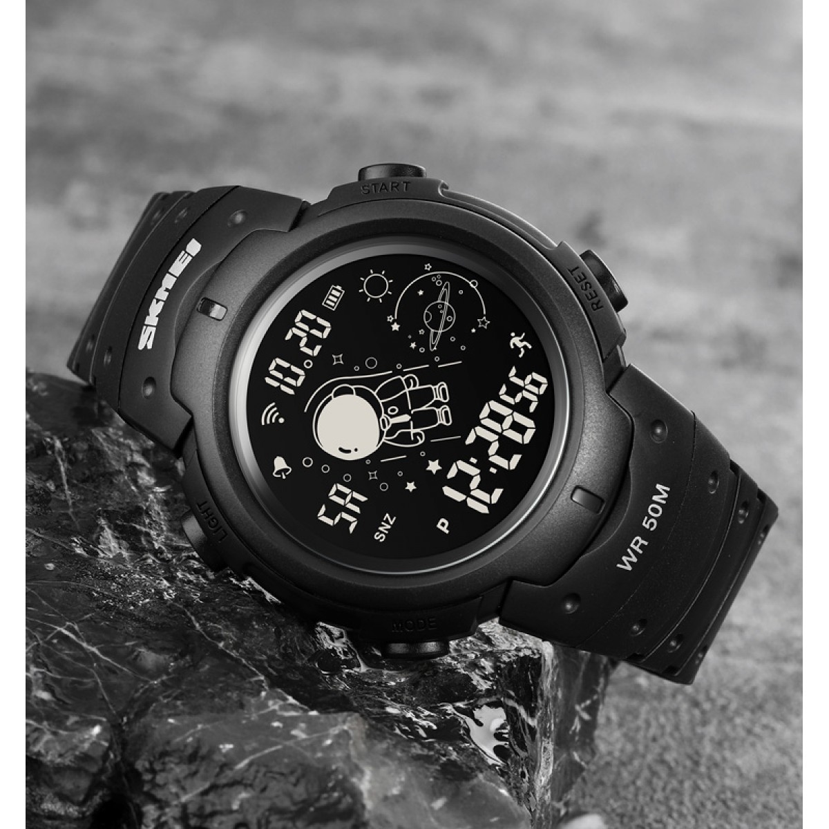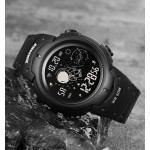 Годинник оснащений електронним механізмом та має ряд корисних функцій, зокрема будильник, календар, секундомір і другий часовий пояс. Він має зрозумілу індикацію з арабськими цифрами та підсвічуванням для зручності у використанні в темряві. Стильний чорний колір корпусу та ремінця підійде до будь-якого образу, а розміри 46 х 48 мм та товщина 15 мм роблять його компактним та легким – вага всього 54 г. Гарантія на гаджет — 12 місяців, що підкреслює його надійність.