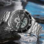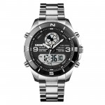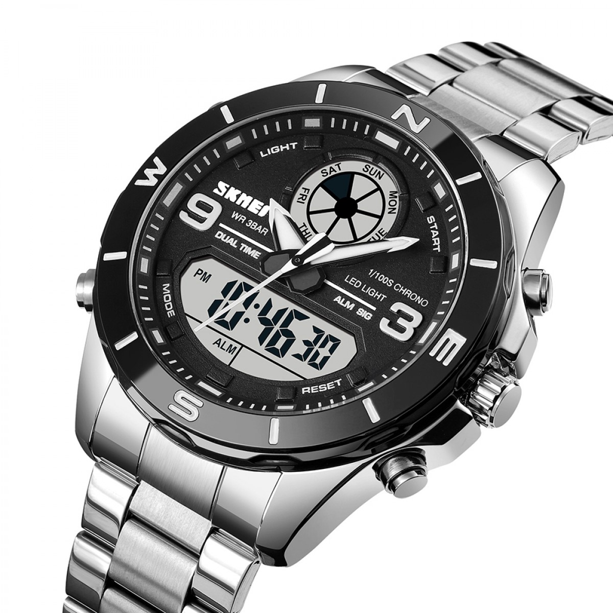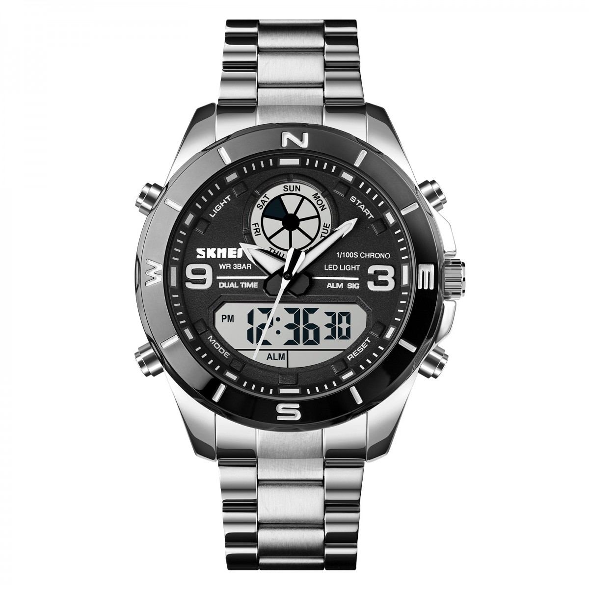 Пристрій обладнаний кварцовим механізмом та має стрілочно-електронний циферблат з підсвічуванням. Годинник оснащений корисними функціями: будильником, календарем, другим часовим поясом і секундоміром. Комфортний браслет завдовжки 23 см і шириною 20 см підходить кожному, а стильний сірий корпус у поєднанні зі сріблястим ремінцем роблять його чудовим доповненням до будь-якого образу.