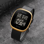 З прямокутним корпусом золотистого кольору та чорним каучуковим ремінцем, він підходить як для чоловіків, так і для жінок. Годинник оснащений функціями будильника, календаря, другого часового поясу та секундоміра. Електролюмінесцентне підсвічування забезпечує зручність у темряві, а чітка індикація часу з арабськими цифрами робить його легким у використанні.