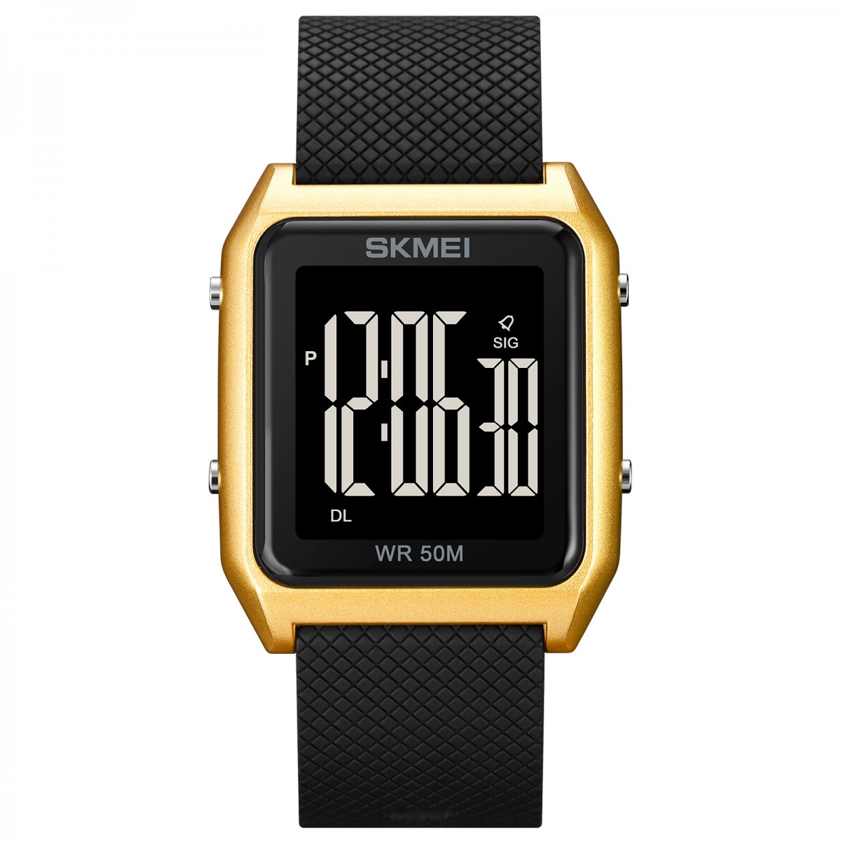 Корпус виготовлений з полімеру золотистого кольору, а чорний каучуковий ремінець забезпечує зручність носіння. Завдяки приямокому прямокутному дизайну та електролюмінесцентній підсвітці, цей годинник буде яскравим доповненням до вашого стилю.
