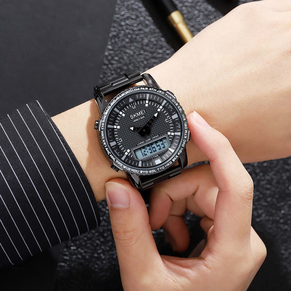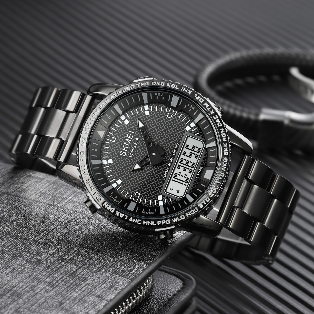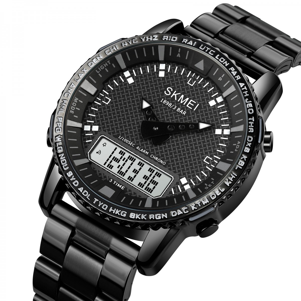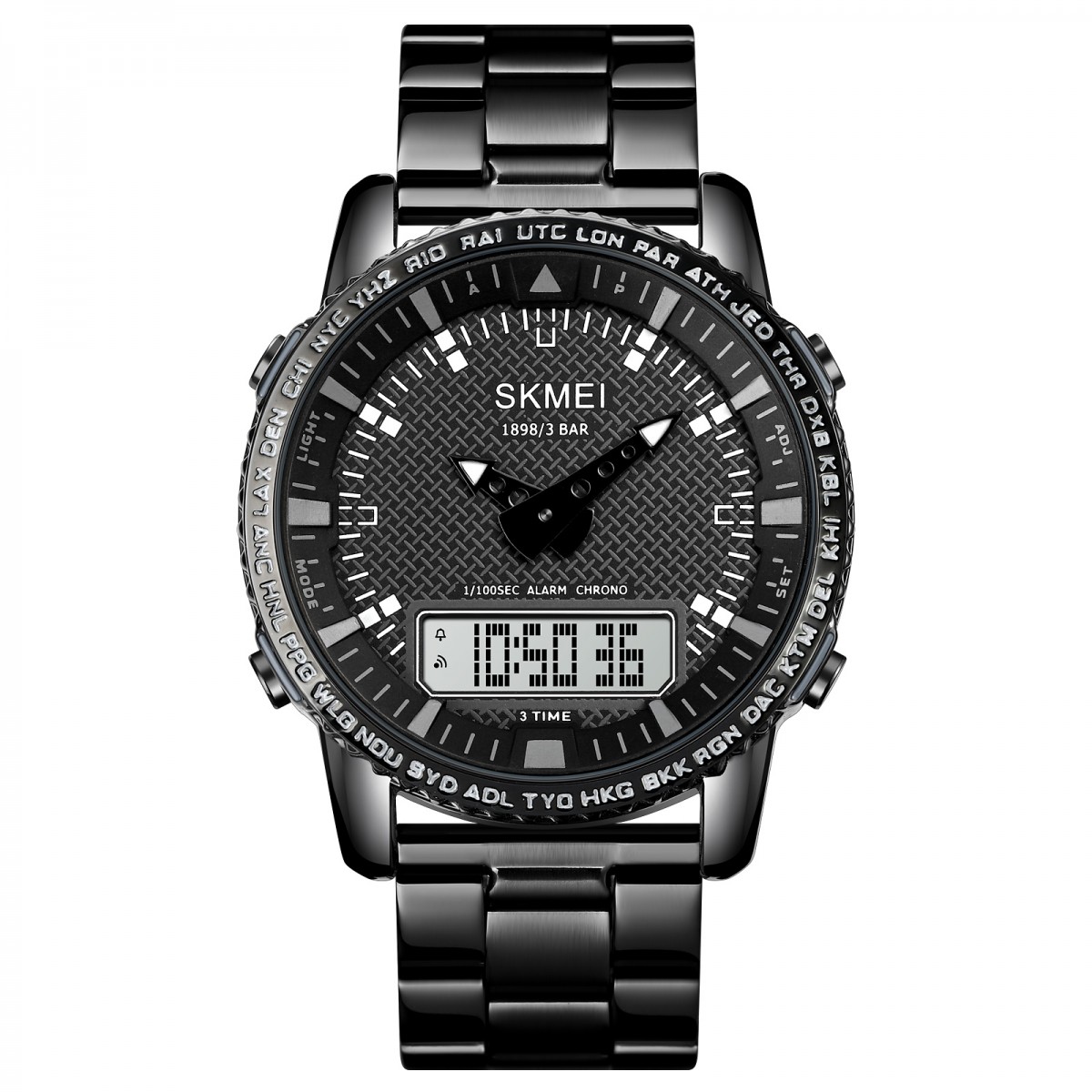 Годинник Skmei 1898BKWT Black-White - це стильний чоловічий аксесуар, що поєднує в собі сучасний дизайн та функціональність. Корпус виготовлений з металу, має чорний колір і круглу форму з діаметром 45 мм та товщиною 13 мм. Ремінець також виконаний з металу та має ширину 22 мм. Годинник оснащений кварцовим механізмом і електронно-аналоговим циферблатом, що відображає години, секунди, день тижня, місяць і число. Він має функції будильника, таймера, другого часового поясу та секундоміра. Водонепроникність до 30 метрів дозволяє носити його навіть у вологих умовах. Скло мінеральне, а підсвічування - електролюмінесцентне. Довжина ремінця складає 23 см, а вага годинника - 144 г. Годинник поставляється з гарантією на 12 місяців. Вироблено в Китаї.