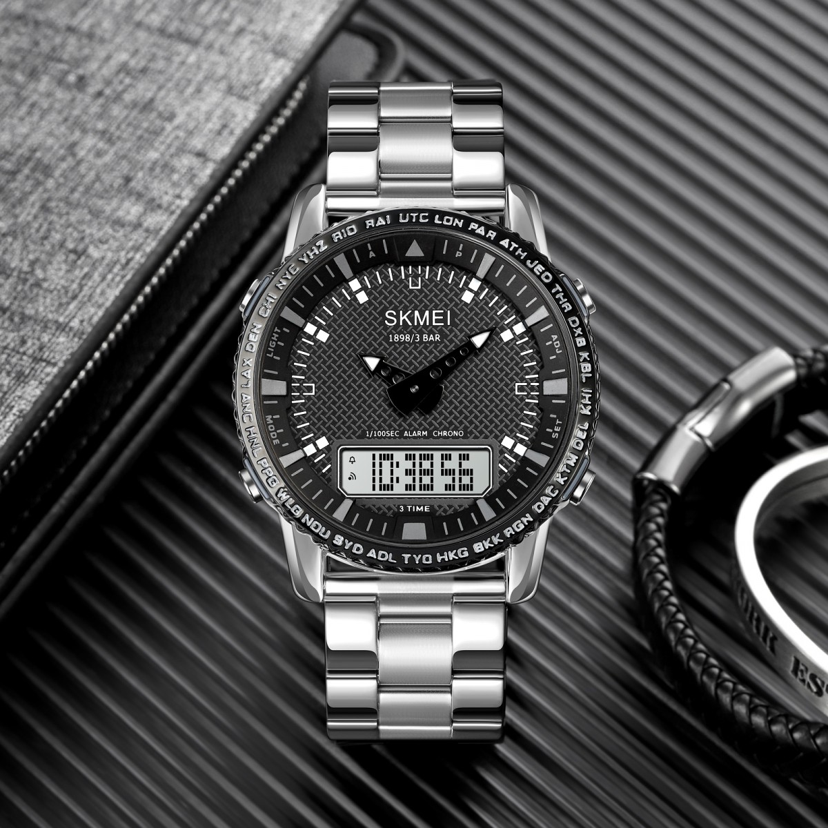 Годинник Skmei 1898SIWT Silver-White - ідеальне поєднання сучасного дизайну та функціональності для чоловіків. Цей кварцовий годинник має металевий корпус та ремінець, забезпечуючи стильний вигляд і комфорт носіння. Водонепроникність до 30 метрів дозволяє використовувати його в різних умовах. Циферблат стрілочно-електронного типу оснащений підсвічуванням, що робить його читання зручним у темряві. Годинник має численні функції, включаючи будильник, таймер, секундомір та другий часовий пояс. Розміри корпусу складають 52 х 45 мм, товщина - 13 мм, а діаметр - 45 мм. Гарантія на цей аксесуар становить 12 місяців. Skmei 1898SIWT - ваш надійний супутник у будь-яких ситуаціях.