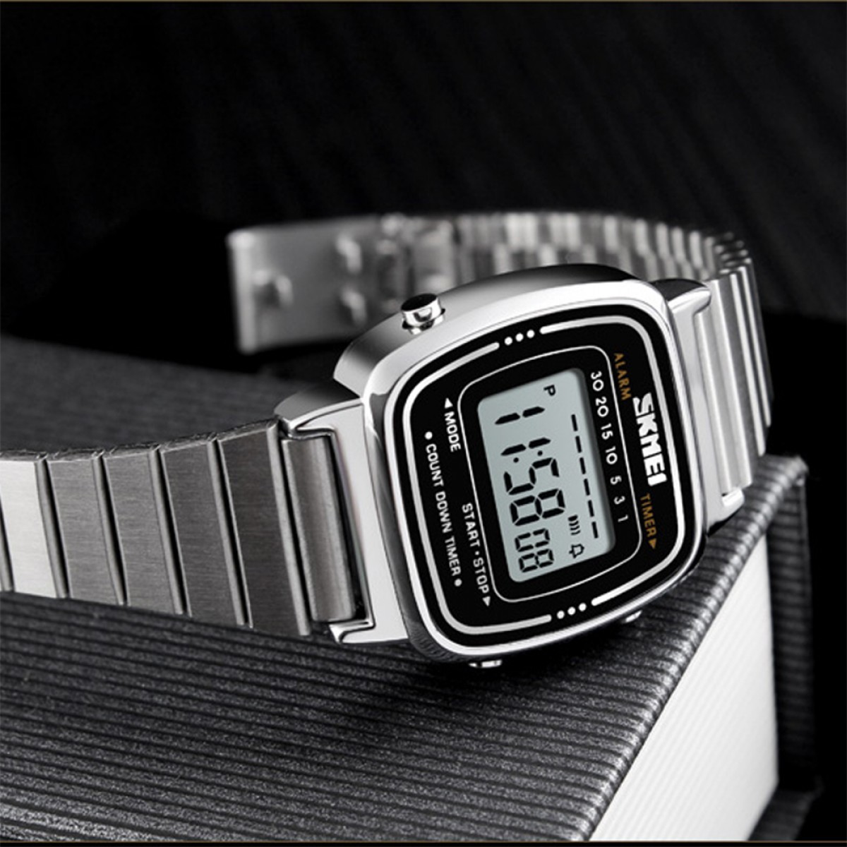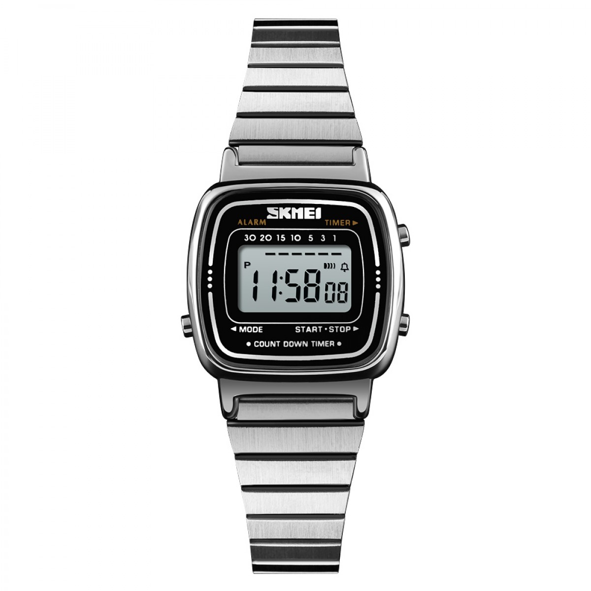 Годинник Skmei 1901SSI - стильний жіночий аксесуар із корпусом та ремінцем з нержавіючої сталі сріблястого кольору. Має електронний механізм та прямокутну форму, що надає класичного вигляду. Водонепроникний до 30 м, обладнаний функціями будильника, календаря та хронографа. Циферблат з арабськими цифрами відображає години, секунди, день тижня, місяць та число. Гарантія на годинник становить 12 місяців. Довжина ремінця - 21,5 см, ширина - 10 мм, вага - 38 г. Вироблено в Китаї.