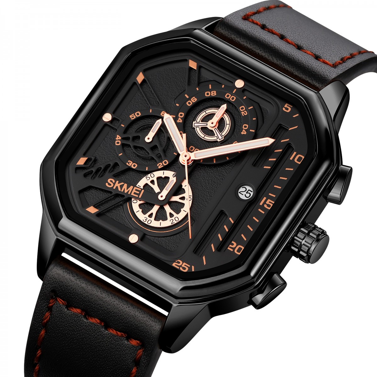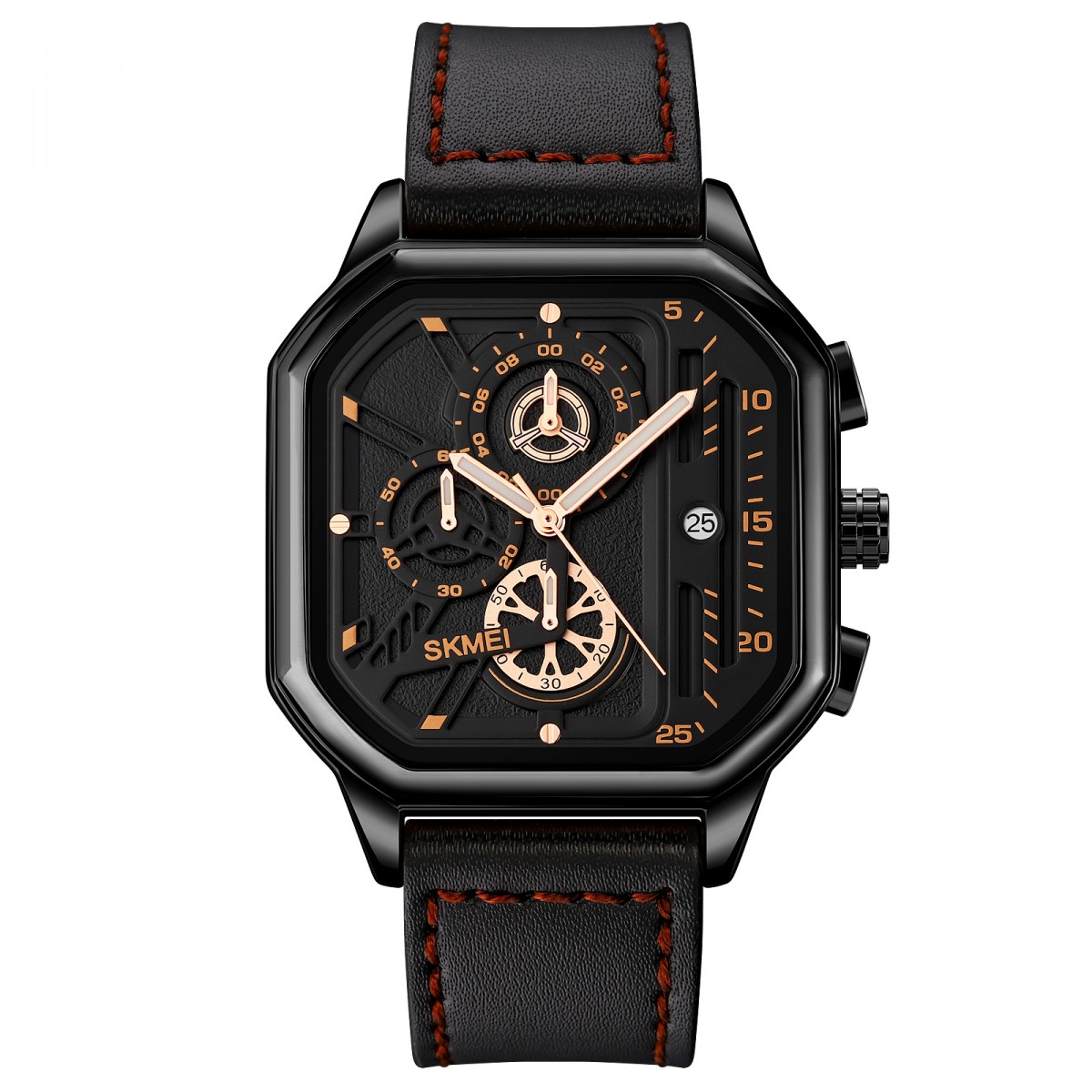 Skmei 1963BKRG Black-Rose-Gold – стильні чоловічі годинники, виготовлені з високоякісних матеріалів. Корпус з металу чорного кольору та шкіряний ремінець забезпечують комфорт та елегантність. Годинники мають водонепроникність до 30 метрів і кварцовий механізм, що гарантує точність. Стрілочний циферблат з індикаторами годин, хвилин, секунд і числом забезпечує дружній інтерфейс використання. Компактні розміри 53 х 42 мм і квадратна форма корпусу роблять цю модель чудовим вибором для casual стилю. Годинники обладнані функціями календаря та секундоміра. Гарантія складає 12 місяців. Вага годинника – 73 г, довжина ремінця – 26,5 см, ширина – 20 см. Вироблено в Китаї.