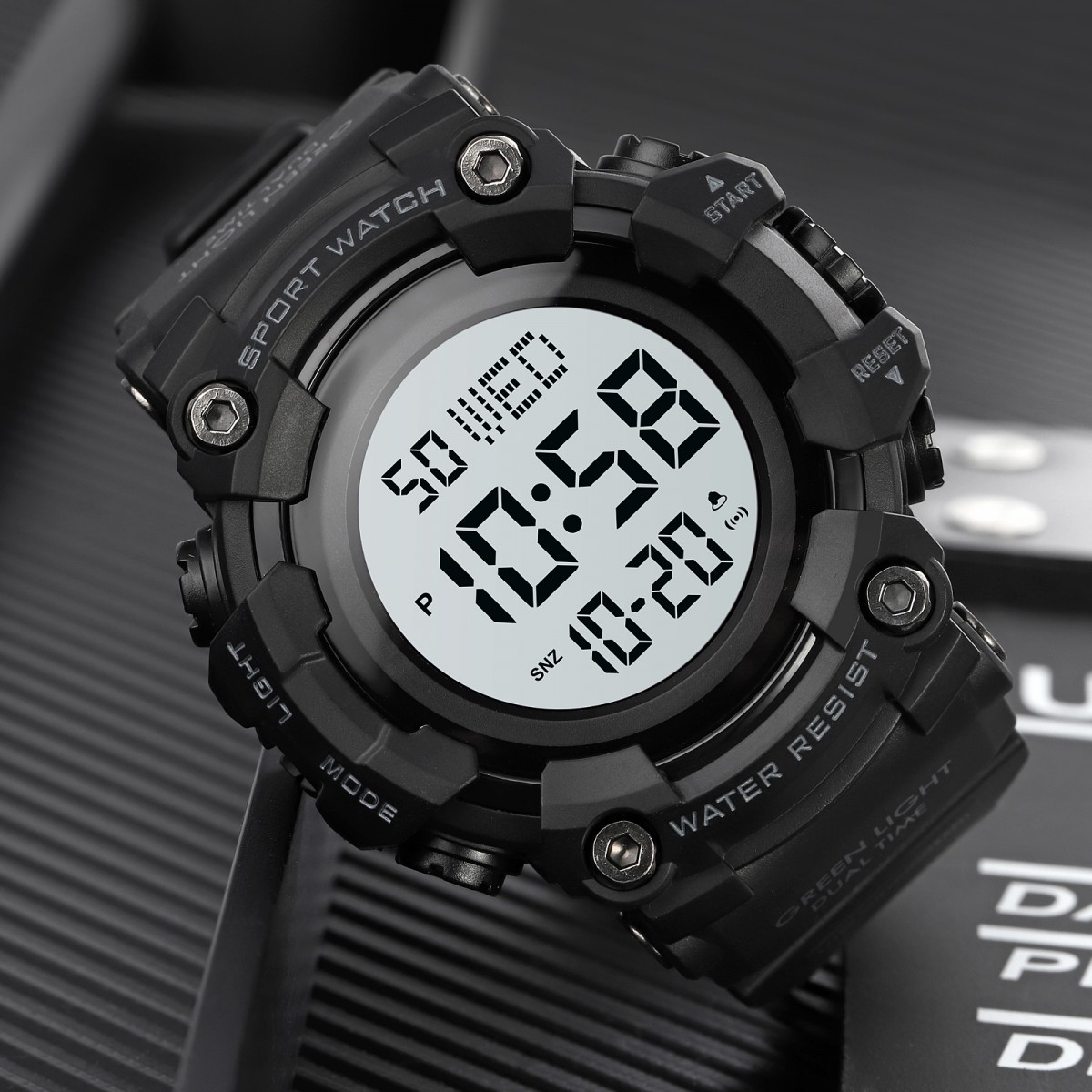 Електронний циферблат з арабськими цифрами має підсвічування, що робить годинники легкими для зчитування у темряві. Модель оснащена функціями будильника, календаря, другого часового поясу та секундоміра.