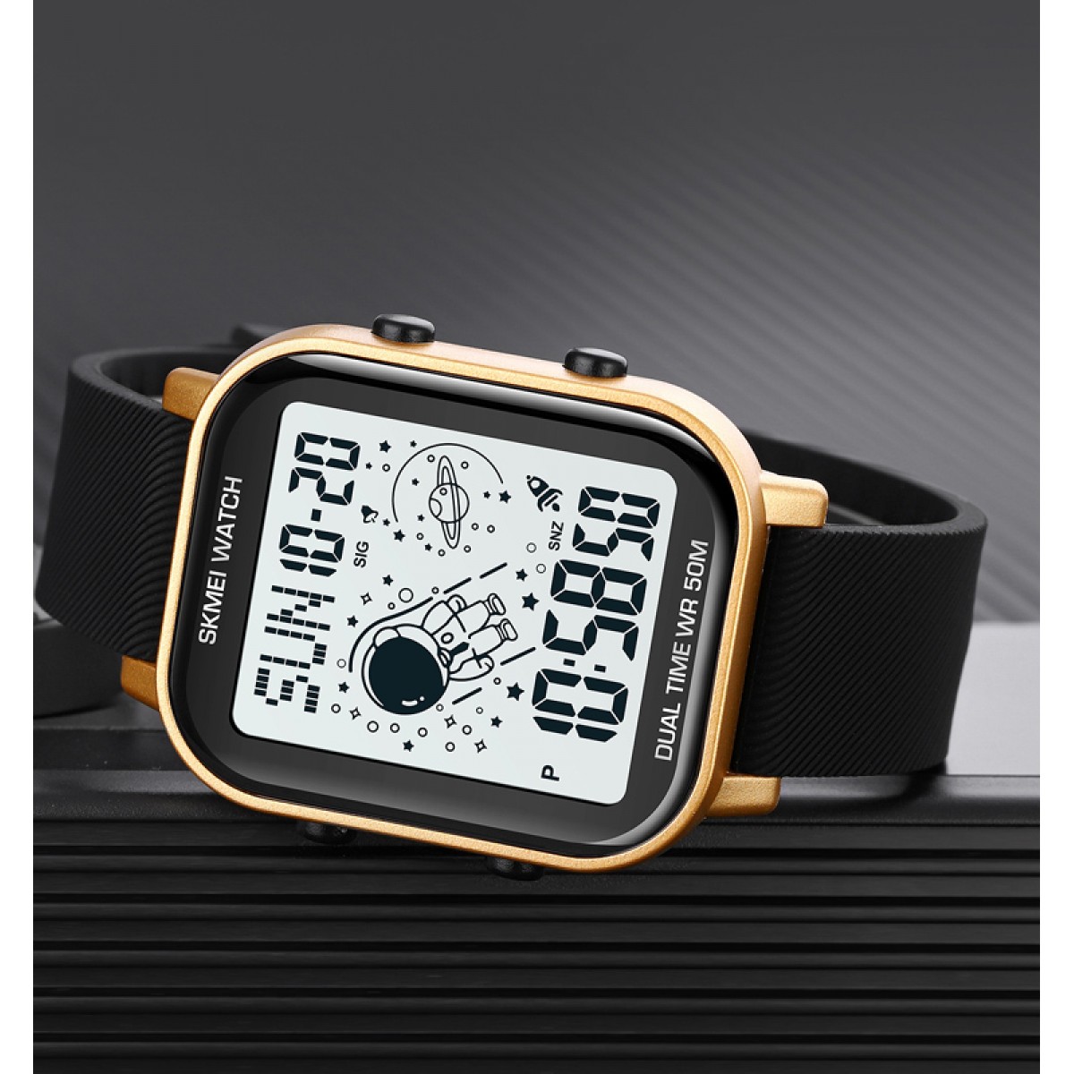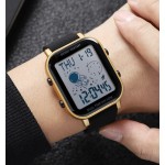 Годинник Skmei 1971GD Gold — стильний та функціональний аксесуар, який підходить як для чоловіків, так і для жінок. Оснащений електронним механізмом та яскравим електронним циферблатом, він забезпечує чітку індикацію часу, дня тижня, місяця та числа. Водонепроникний до 50 м, годинник у золотистому корпусі з полімеру поєднується з чорним каучуковим ремінцем, що додає нотки елегантності. Серед функцій — будильник, календар, секундомір та другий часовий пояс. Годинник має прямокутну форму, з електролюмінесцентним підсвічуванням для зручності у темряві. Гарантія на товар становить 12 місяців.