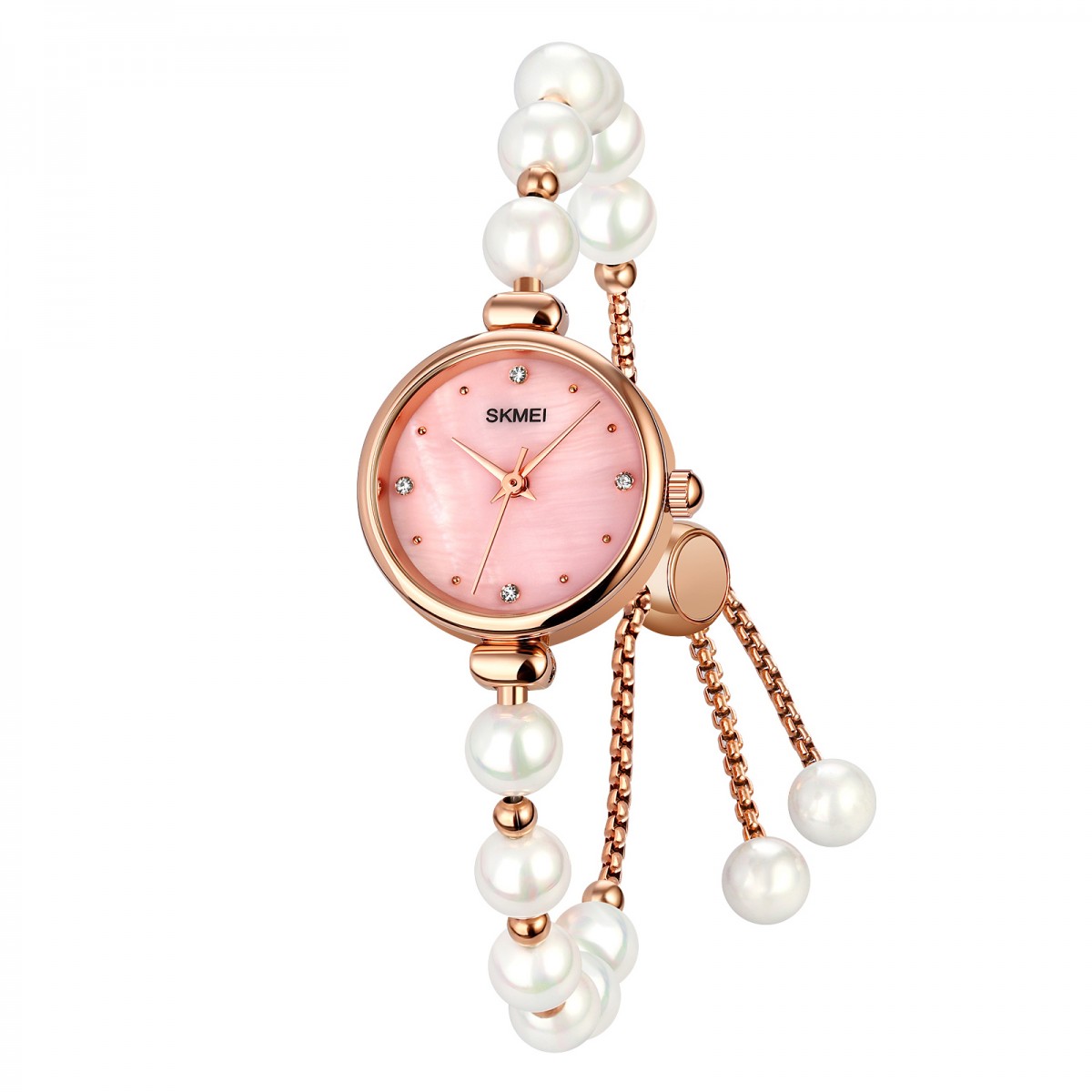 Годинник Skmei 1983PKWT Pink-White є стильним аксесуаром для жінок, який поєднує елегантність та комфорт. Корпус виконаний з цинкового сплаву, а ремінець з натурального каміння та міді. Модель має круглу форму, мінеральне скло і водонепроникність до 30 метрів, що робить її ідеальною для повсякденного використання. Кварцовий механізм забезпечує точність, а стрілочний циферблат з індексами відображає години, хвилини і секунди. Годинник має романтичний колір - рожеве золото для корпусу та білий для ремінця, вирізняючись стильним casual і класичним дизайном. Забезпечується 12-місячна гарантія. Вага годинника складає 24 грами, а його розміри - 22,8 х 29 мм.
