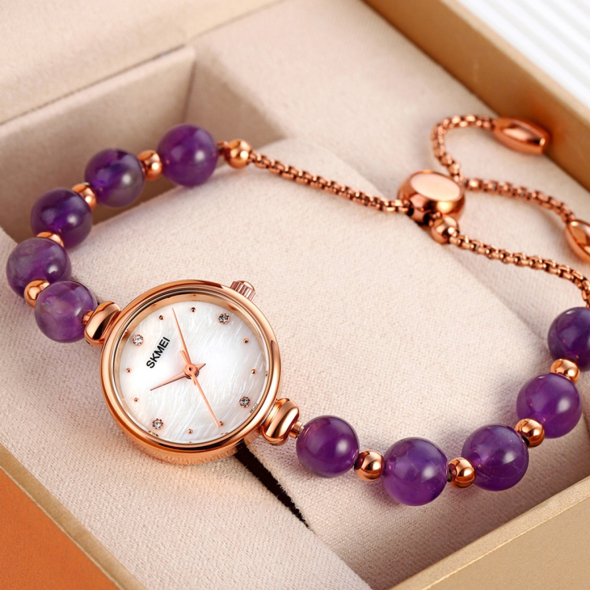 Ремінець виготовлений з натуральних каменів і міді, підкреслюючи особливий стиль та неповторність. Цей годинник не тільки стильний, але й водонепроникний на глибину до 30 м, що дозволяє вам бути впевненою в його надійності.