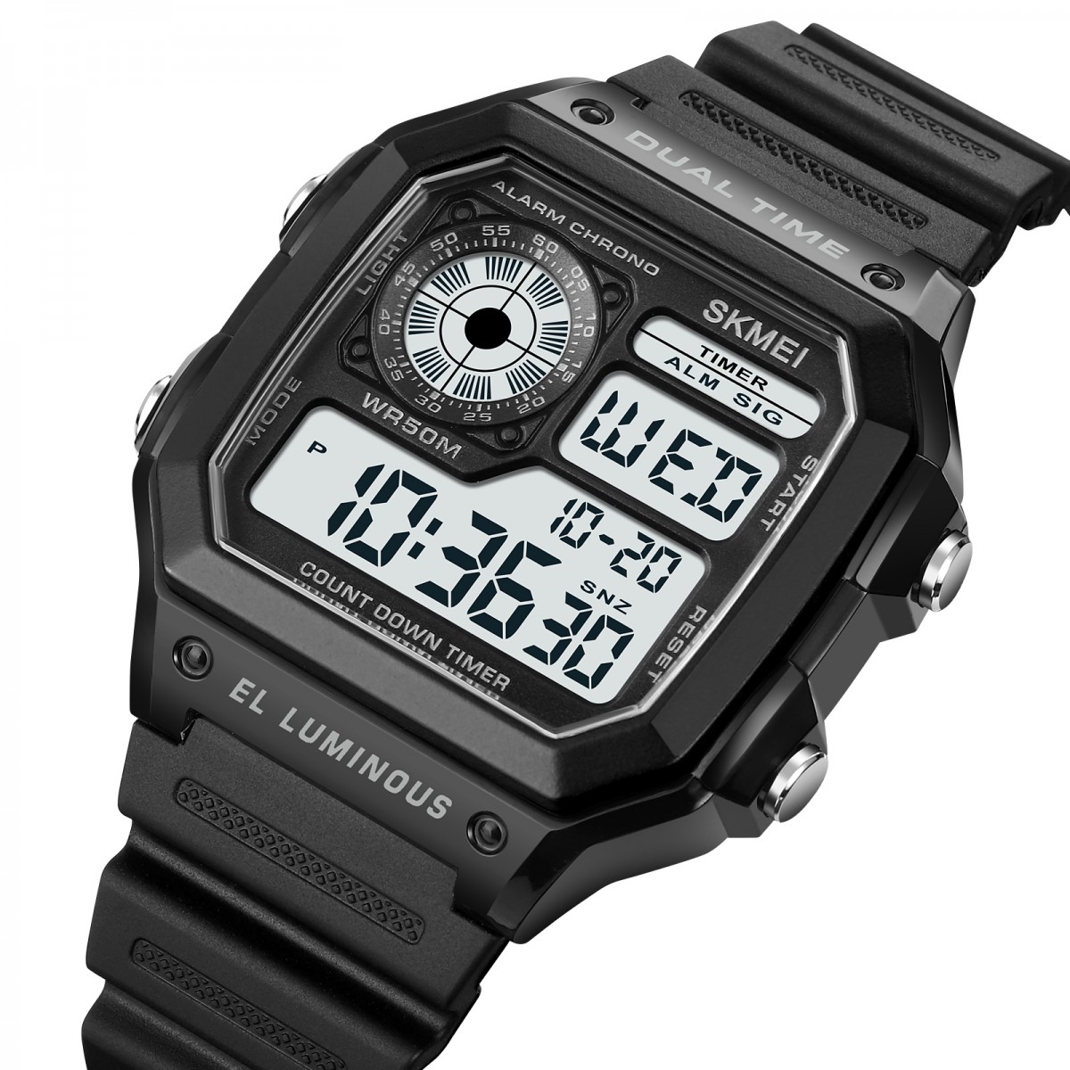 Електронний циферблат з арабськими цифрами забезпечує легкість в зчитуванні часу. Годинник обладнаний підсвічуванням, будильником, календарем та секундоміром, що робить його універсальним помічником у повсякденному житті. Квадратна форма корпусу в чорному кольорі додає елегантності, а стильний дизайн підійде як чоловікам, так і жінкам.