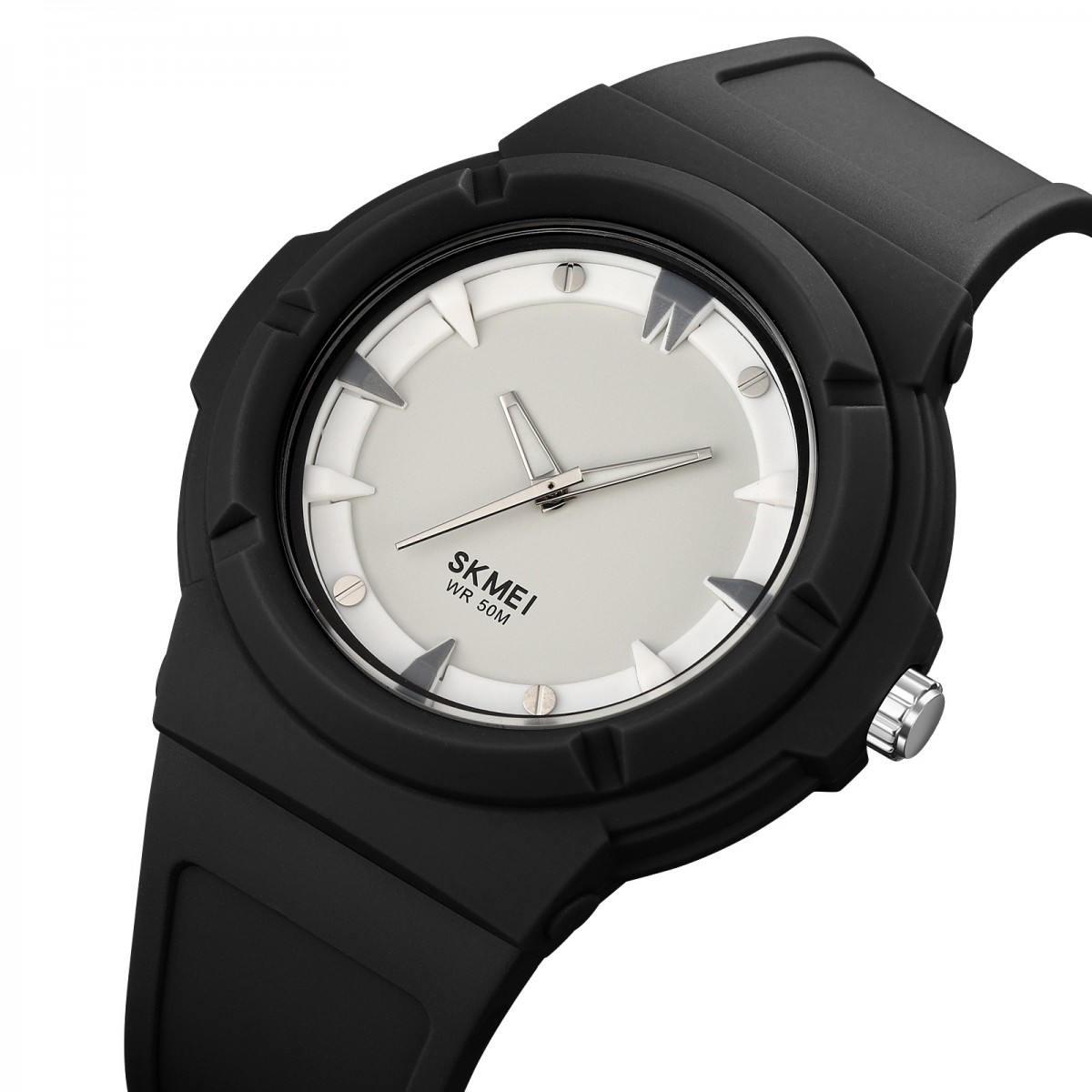 Годинник має круглу форму корпусу розміром 44 х 44 мм. Стрілочний циферблат, оформлений індексами, забезпечує легку читабельність часу. Механізм кварцовий, а індикація включає години, хвилини та секунди. Чорний колір корпусу та ремінця додає елегантності, а стиль casual робить його універсальним для будь-якого образу. Гарантія на годинник складає 12 місяців, а вага - всього 34 г. Бренд: Skmei, країна виробника: Китай.