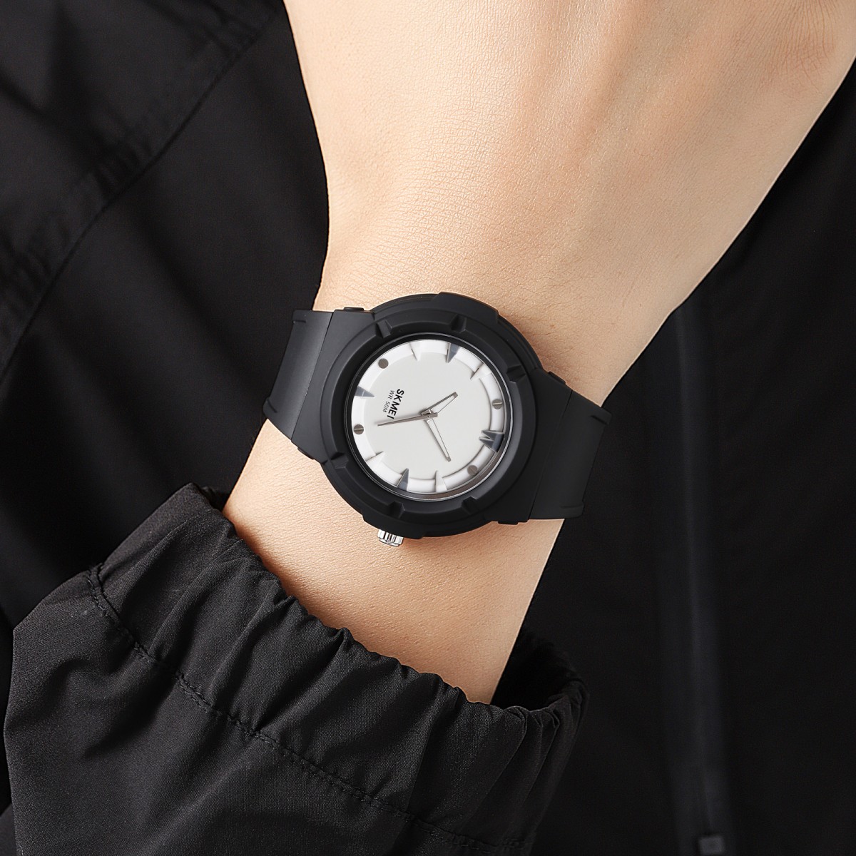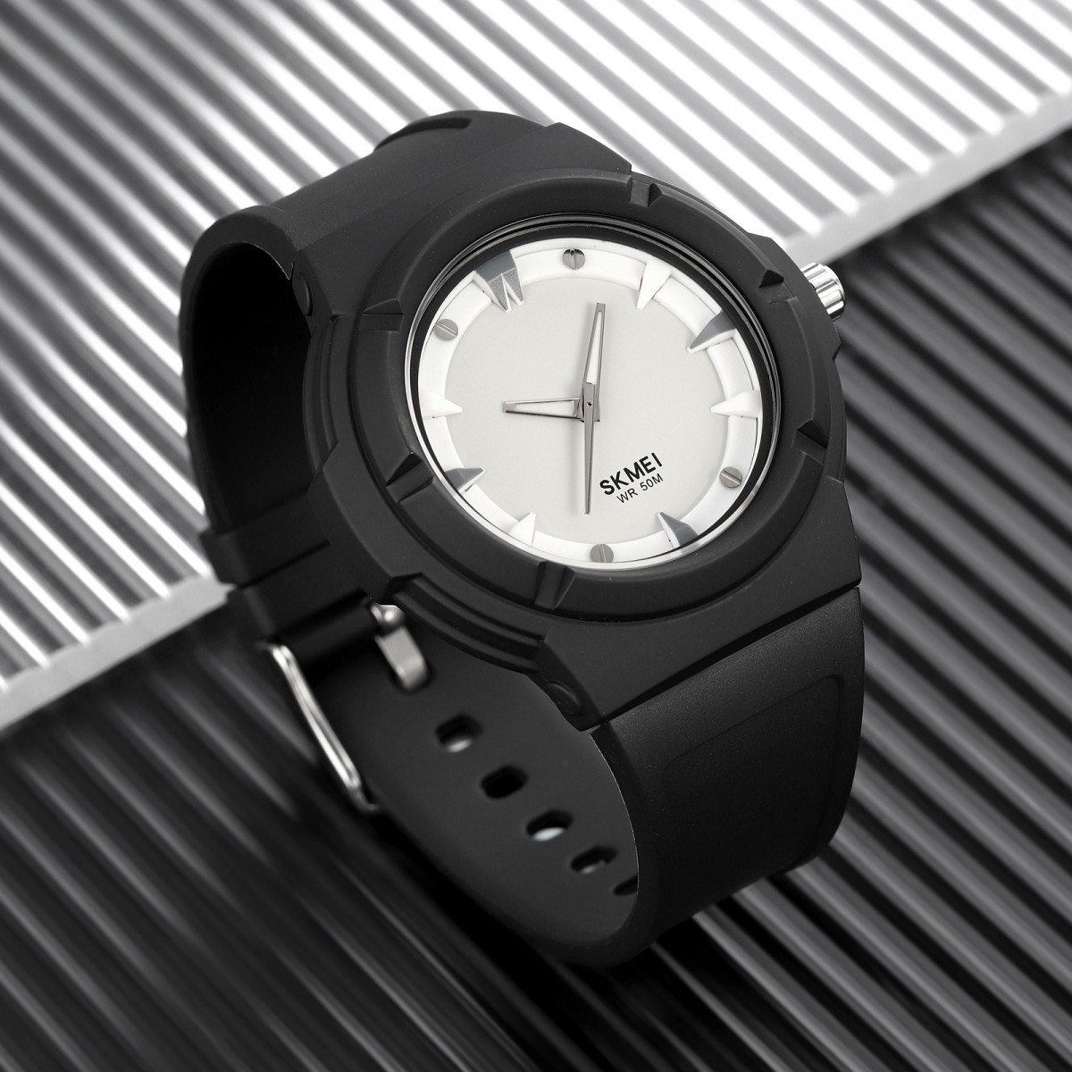 Годинник Skmei 2011BKWT Black-White - стильний жіночий аксесуар, що поєднує практичність і сучасний дизайн. Його водонепроникність 50 м забезпечує можливість використання під час купання та інших водних активностей. Корпус виготовлений з полімеру, а ремінець - з TPU, що гарантує міцність та комфорт під час носіння.
