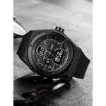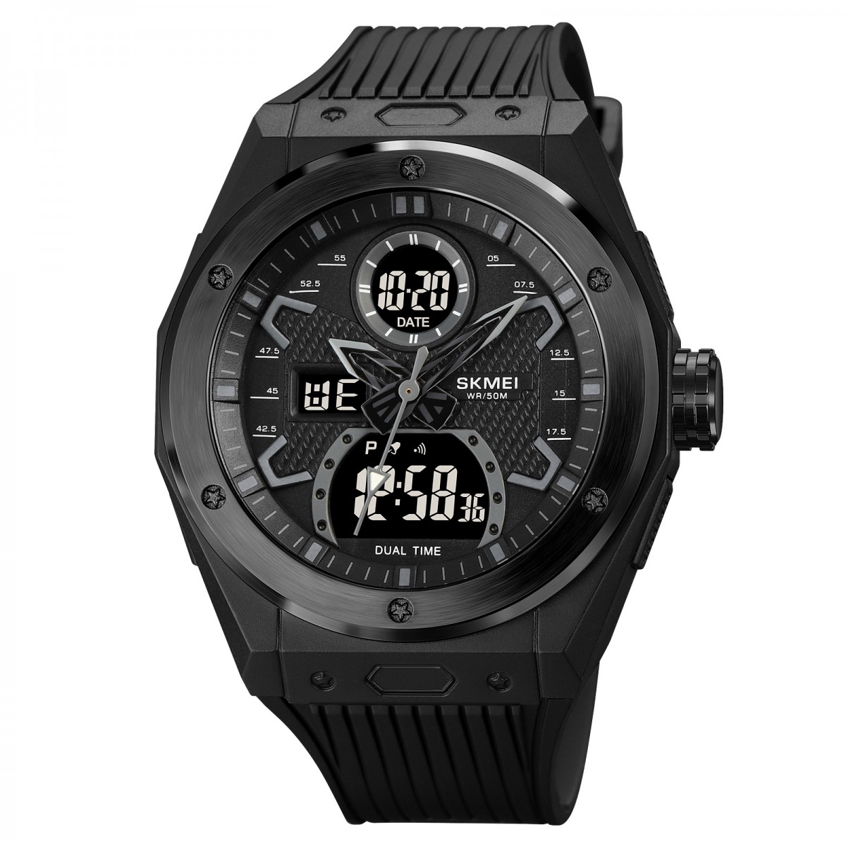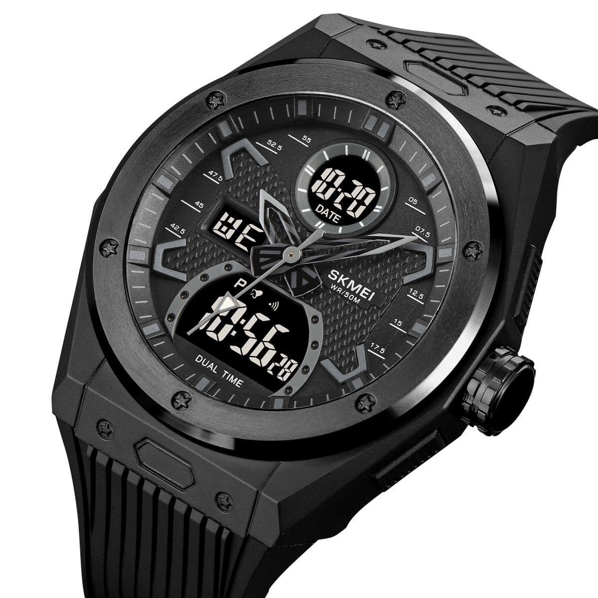 Цей пристрій володіє кварцовим механізмом та стрілочно-електронним циферблатом, який включає індикацію годин, хвилин, секунд та дати. Годинники також мають підсвічування, функції будильника, календаря, другого часового поясу та секундоміра. Чорний корпус і ремінець створюють стильний вигляд, а електролюмінесцентне підсвічування додає сучасності. Годинники мають гарантію 12 місяців і виготовлені в Китаї. Довжина ремінця становить 25 см, ширина – 25 мм, а вага – 59 г.