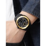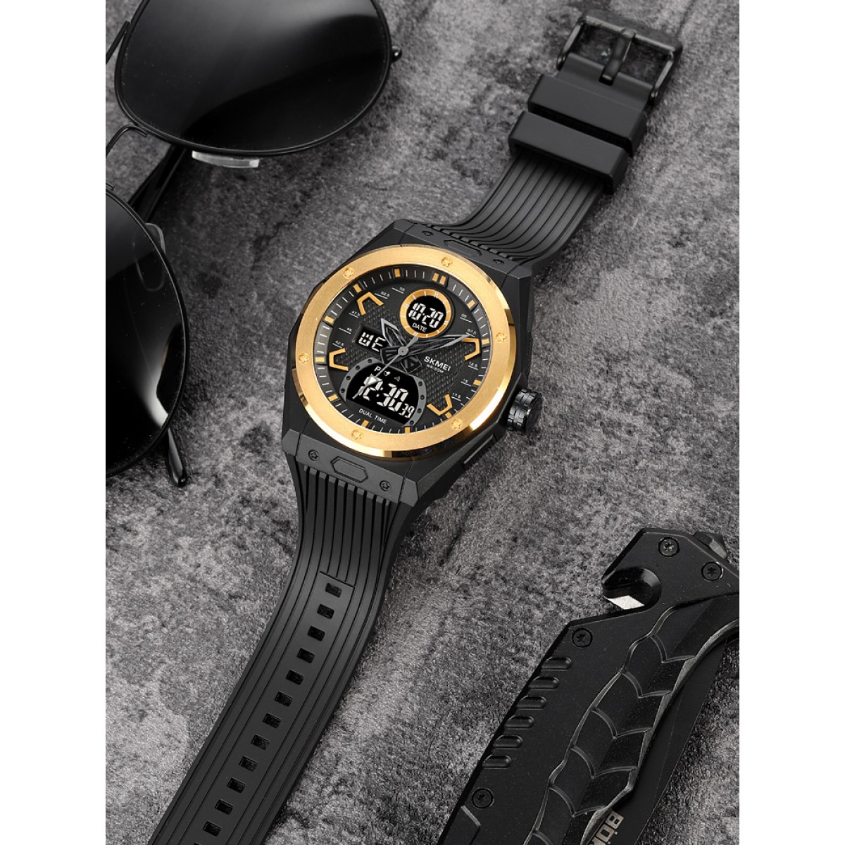 Годинник Skmei 2013GD Gold поєднує у собі стиль та функціональність. Він має водонепроникність до 50 метрів, що робить його ідеальним для спорту і повсякденного використання. Корпус виготовлений з полімеру, а ремінець з каучуку, що забезпечує комфорт при носінні. Чоловічий годинник має круглу форму корпусу розмірами 53 х 46 мм та важить всього 59 грамів. Кварцовий механізм підтримує стрілочно-електронний циферблат з індикацією годин, хвилин, секунд та дати. У годиннику присутні корисні функції, такі як будильник, календар, секундомір та другий часовий пояс. Електролюмінесцентне підсвічування гарантує хорошу видимість у темряві, а стильний чорний/золотистий дизайн підійде до будь-якого спортивного чи casual образу. Годинник забезпечується 12-місячною гарантією.