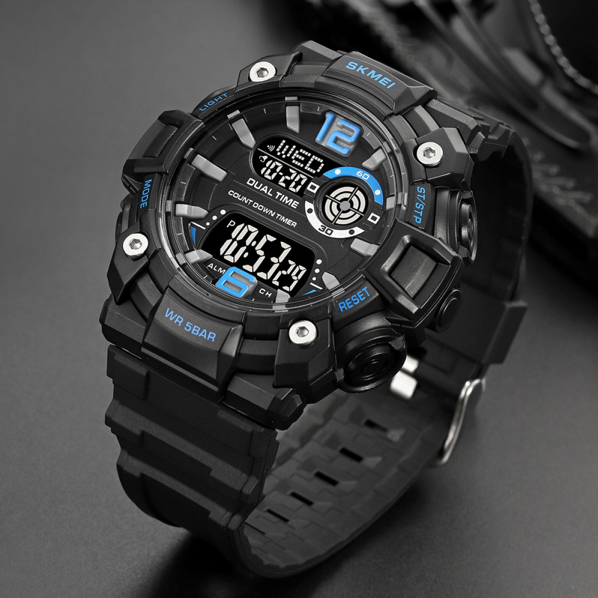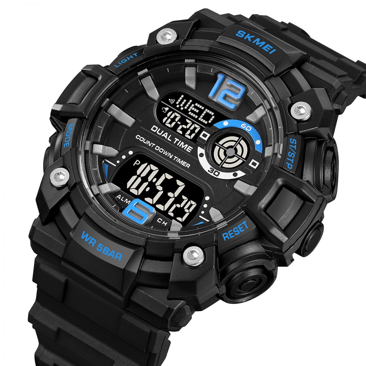 Годинник Skmei 2018BUBK Blue-Black – це спортивний електронний годинник, створений для чоловіків, який поєднує в собі стиль і функціональність. Має водонепроникність до 50 метрів, що робить його ідеальним для активного використання. Корпус виготовлений з полімеру, а ремінець – з каучуку, що забезпечує комфорт та міцність.