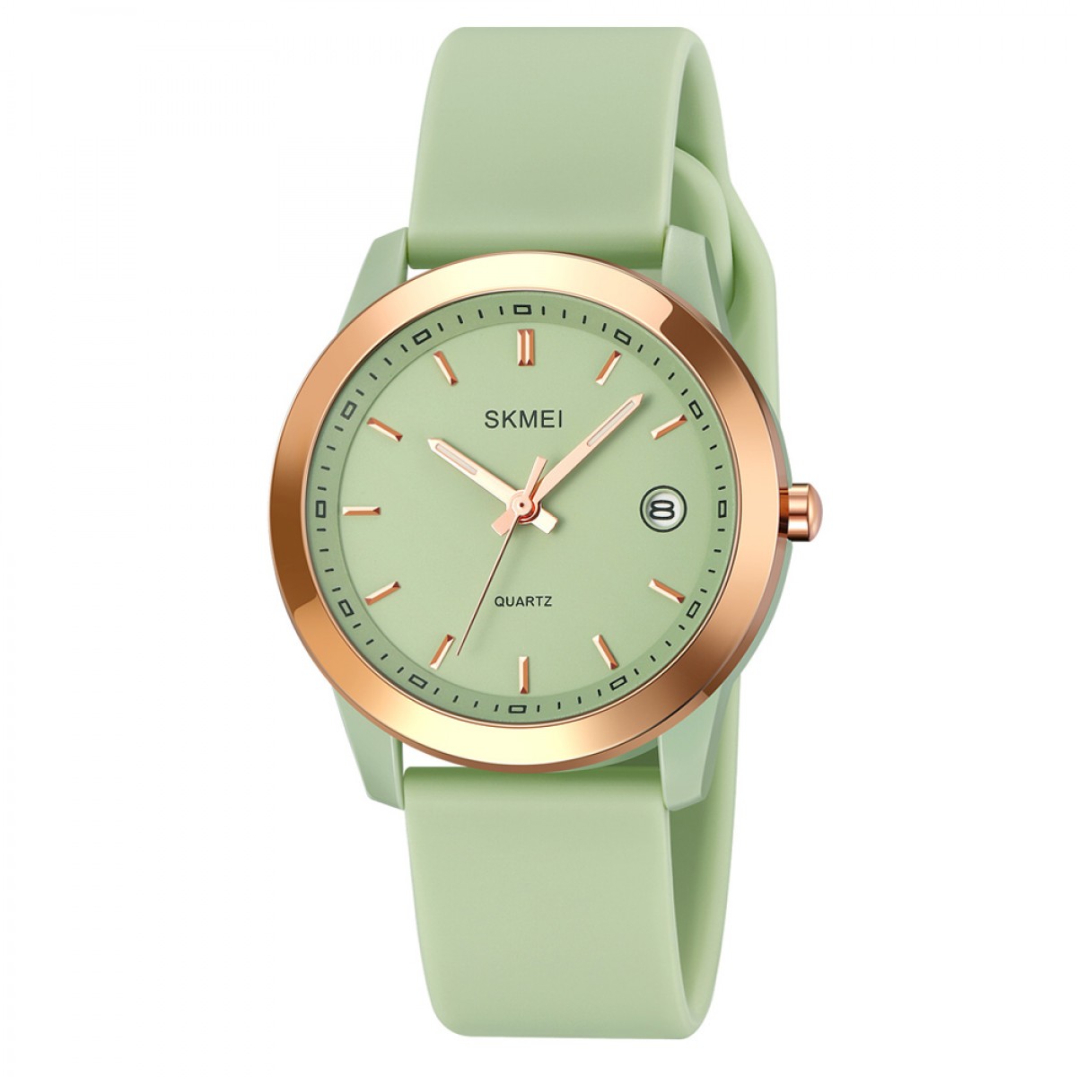 Представляємо вам елегантний жіночий годинник Skmei 2319GN в зеленому виконанні. Цей стильний аксесуар стане ідеальним доповненням до будь-якого образу, завдяки поєднанню класичного та casual стилю. Корпус годинника, виготовлений зі сталі золотистого кольору, має діаметр 35 мм, а зручний силіконовий ремінець довжиною 22 мм забезпечує комфорт під час носіння.