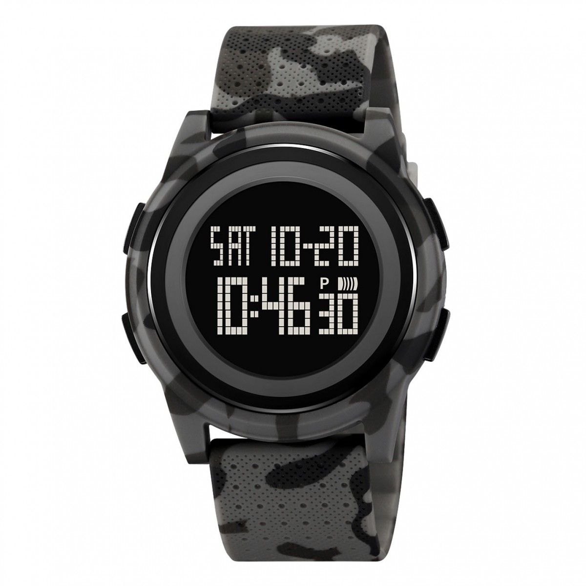 Спортивний, армійський та casual стиль дозволяє носити ці годинники в різних обставинах. Електронний циферблат оснащений функціями другого часового поясу, хронографа, будильника та календаря. Камуфляжний сірий колір надає їм унікального вигляду.