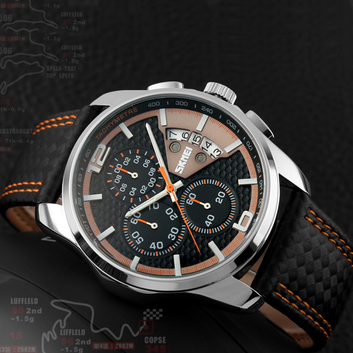 Годинник Skmei 9106OG Silver-Black-Orange — стильний аксесуар для сучасного чоловіка. Його круглий металевий корпус сріблястого кольору поєднується з чорним шкіряним ремінцем, що забезпечує комфорт під час носіння. Механізм кварцовий, а циферблат має стрілочний формат з індикацією годин, хвилин, секунд та числа. Годинник оснащений функцією календаря та хронографа, що робить його практичним у повсякденному використанні. Водонепроникність до 30 метрів забезпечує додатковий захист, а мінеральне скло гарантує довговічність. Розміри годинника — 49 х 46 мм, а вага становить лише 65 г. Годинник має гарантію 12 місяців та виробляється в Китаї. Ідеальний вибір для любителів casual та класичного стилю.