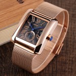 Цей класичний годинник має прямокутну форму корпусу і мінеральне скло, що захищає циферблат. Кварцовий механізм забезпечує точний хід, а функції календаря та хронографа додають зручності в користуванні. Годинник оснащений стрілочним циферблатом з арабськими та римськими цифрами для зручного читання часу.