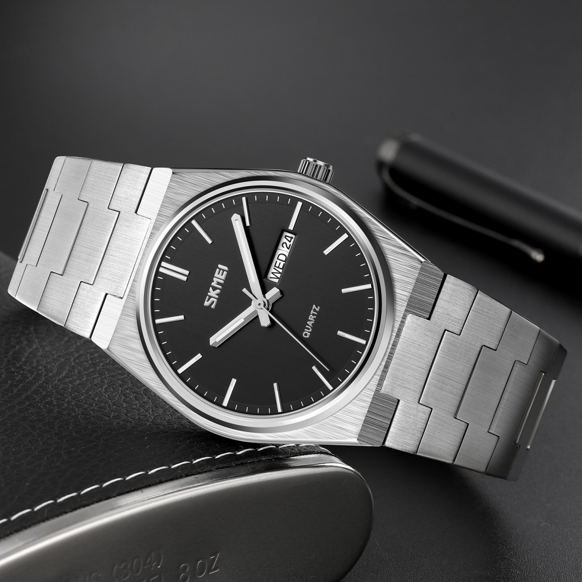 Годинник Skmei 9288SIBK Silver-Black – стильний чоловічий аксесуар, що поєднує в собі елегантність і функціональність. Корпус виготовлений з міцного металу сріблястого кольору, а ремінець – з нержавіючої сталі, забезпечуючи комфорт та надійність. Годинник має водонепроникність до 30 метрів та кварцовий механізм, що гарантує точність часу.