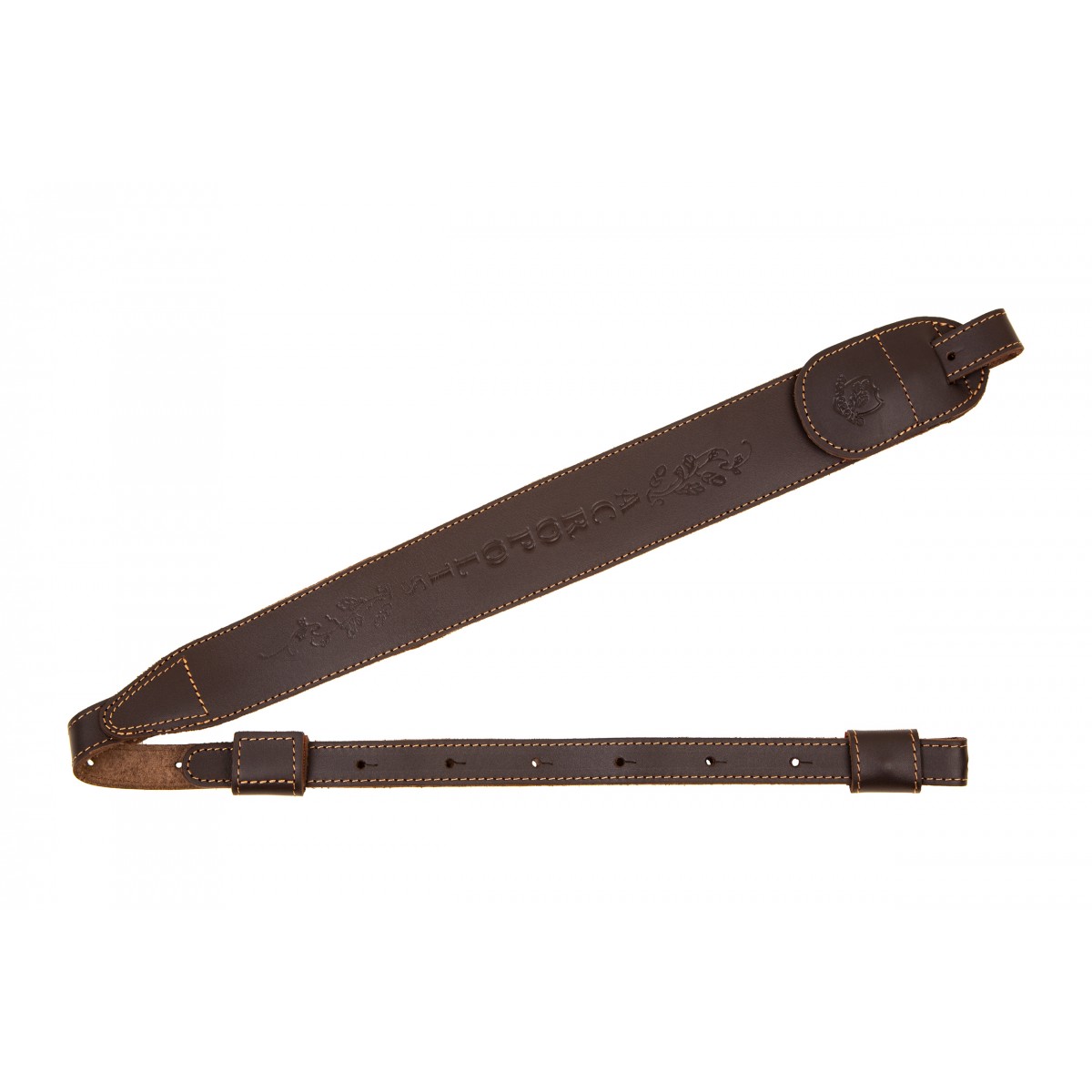 Шкіряний ремінь для зброї має рельєфне тиснення. Усі металеві деталі приховані для запобігання пошкодження прикладу та ствола зброї. Ремінь кріпиться за допомогою кообурних гвинтів. Зручна широка плечова частина. Довжина ременя регулюється.