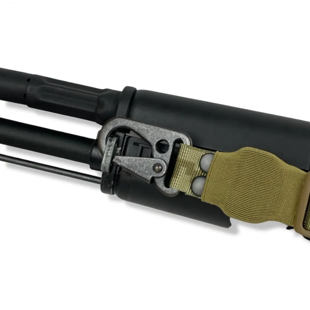 Ремінь можна закріпити за стовбур як ремінною стрічкою так і карабіном, що йде в комплекті.