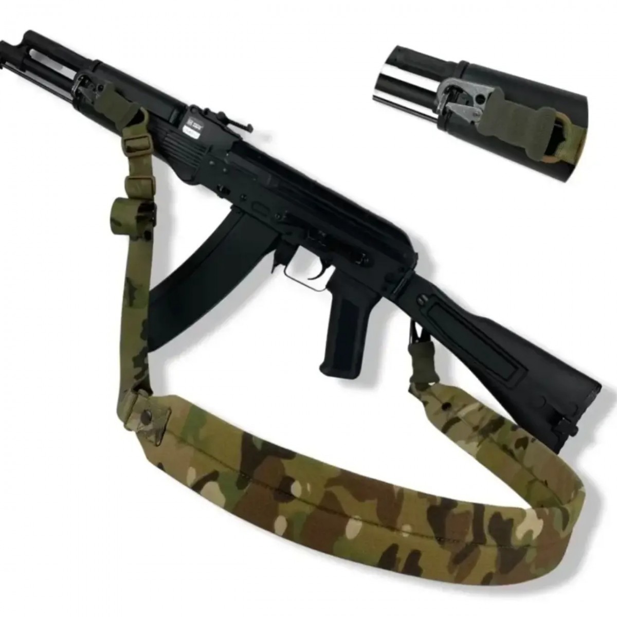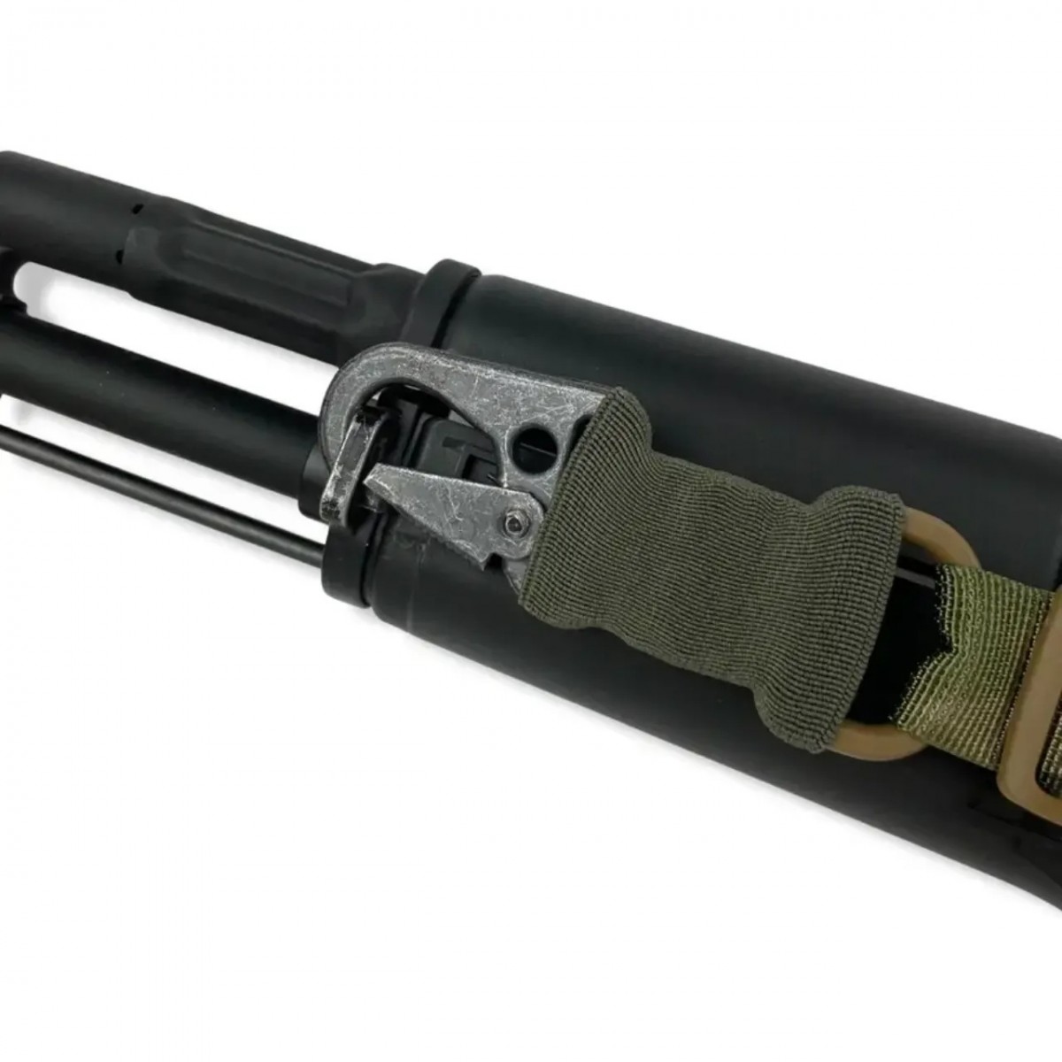 Ремінь можна закріпити за стовбур як ремінною стрічкою так і карабіном, що йде в комплекті.