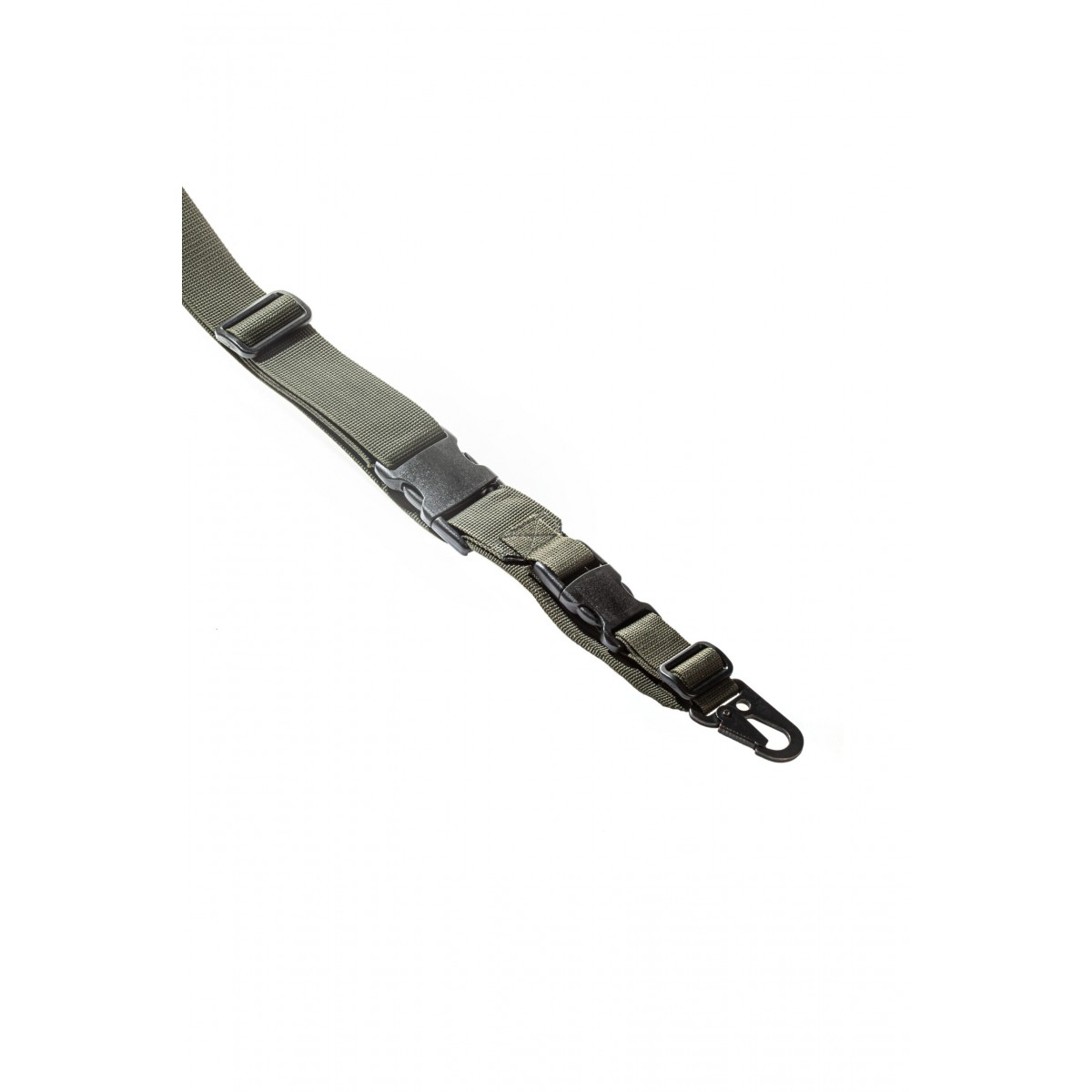 Збройовий триточковий ремінь має регулювання за об'ємом. Спеціальна пряжка для швидкого регулювання довжини ременя. Застібка FASTEX, що швидко відкривається. Ширина ременя - 4 см. З тильного боку кріпиться за приклад (обтискне кріплення), а спереду за допомогою петлі.