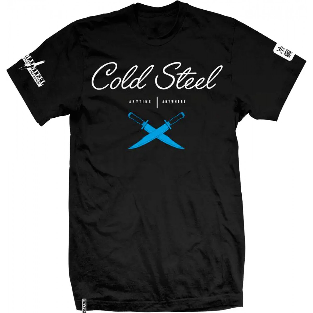На фронтальному принті моделі Cross Guard T-Shirt від компанії Cold Steel зображені перехрещені ножі з клинками типу "боуї" та логотип.