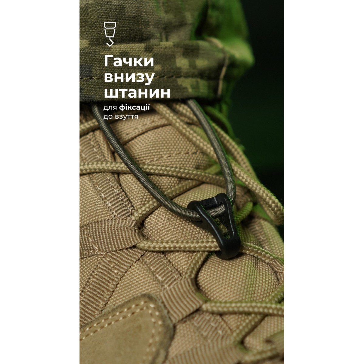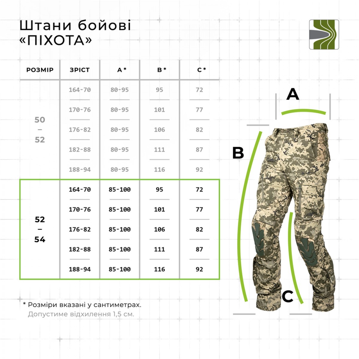 Повноцінний елемент бойового спорядження, що допомагає у виконанні місій ✅ Ключові переваги 12 функціональних кишень Відсіки під бронепакети та демпфери в зоні колін Еластичні вставки для більшої свободи рухів та вентиляції Посилення у зонах підвищеного зношування (сідниці, коліна, бічні кишені) Регулювання у ділянках талії, колін і низу Гачки для кріплення штанів до взуття Петлі для ременя з тримачами для карабінів Виготовлені з витривалих матеріалів: ріп-стоп NYCO, Flex 4 Way Stretch, нейлон 1000D (аналог Cordura) Опис товару Бойові штани «Піхота» розроблені фахівцями «Балістика» у співпраці з військовими та відповідають потребам фронту. Виготовлені зі зносостійких матеріалів, що витримують постійне тертя, навантаження та вплив довкілля. Завдяки клапанам з липучкою у зоні талії, колін та кісточок можна відрегулювати обхват залежно від статури бійця та зручності для нього. Еластичні вставки в зоні попереку, промежини, колін забезпечують свободу рухів та частково сприяють циркуляції повітря. Зона сідниць зміцнена подвійним шаром тканини. Відсіки для бронепакетів та демпферів виконані з нейлону 1000D. На них нашиті пластикові елементи, що захищають коліна від випадкових ударів. ℹ️ Бронепакети в наколінники входять до комплекту Гульфик замикається на блискавку, прикриту клапаном, а на поясі додатково застібається латунними кнопкою і гачком. На внутрішній стороні нижніх манжетів розташовані пластикові гачки для фіксації штанин до шнурків взуття. Вони не дають штанам «підстрибувати», а також перешкоджають потраплянню всередину бруду, камінців, холодного повітря. Шість широких петель для ременя знизу оснащені тримачами для карабінів. Кишені в бойових штанах «Піхота» Всі кишені парні і вміщені на кожній штанині у дзеркальному положенні. 1️⃣ Дві відкриті передні косі кишені 2️⃣ Дві відкриті бокові кишені Вони відшиті з кордури та придатні для зберігання інструментів на зразок складного ножа, мультитула, які можуть пошкодити менш щільну тканину. 3️⃣ Дві плоскі задні кишені на велкро-клапанах 4️⃣ Дві великі кишені з подвійним доступом Нашиті на передній частині стегна. Вміщують до двох споряджених магазинів на 30 набоїв. Для доступу до вмісту можна скористатися верхнім клапаном із велкро або вертикальною блискавкою збоку. Завдяки складкам на дні та збоку об’єм кишень може збільшуватися при наповненні. 5️⃣ Дві кишені для телефона та павербанка Пришиті на великі стегнові кишені та мають окремий доступ із клапаном на липучці. 6️⃣ Дві кишені під турнікети Розташовані у нижній частині штанин та закриваються клапаном з велкро. Спеціально пристосовані під турнікет – вузькі, об’ємні, видовжені та оснащені механізмом екстракції. Для його спрацювання потрібно потягнути за язичок зі стропи, який подасть турнікет просто в руку. 7️⃣ Два технічні відсіки на велкро-клапанах Містять балістичний захист та демпферні вставки. Задня внутрішня частина цих відсіків виконана з еластичного матеріалу, який робить їх більш місткими і приємними до шкіри. ❓ Часті запитання Чи можна носити штани в негоду або холод? Так. Штани «Піхота» чудово підходять для демісезону. Взимку їх можна носити з термобілизною, але для цього краще взяти на розмір більші. Вони витривалі, не пропускають бруд, захищають від вітру, добре тримають форму навіть у вологих умовах. Чи