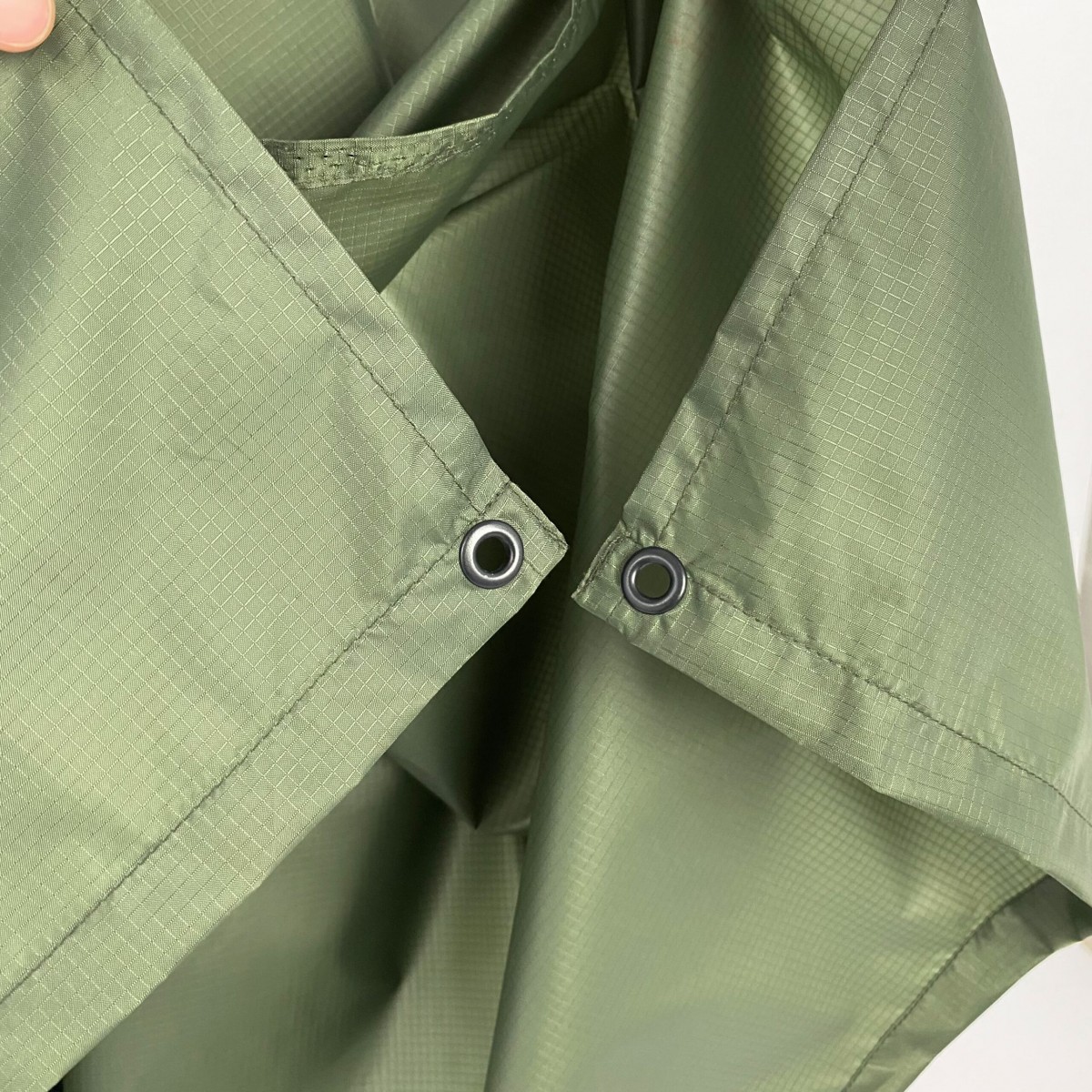- За декілька рухів трансформується із плаща-накидки у невеликий намет. Для фіксації намету по периметру плаща вшиті великі пластикові люверси.