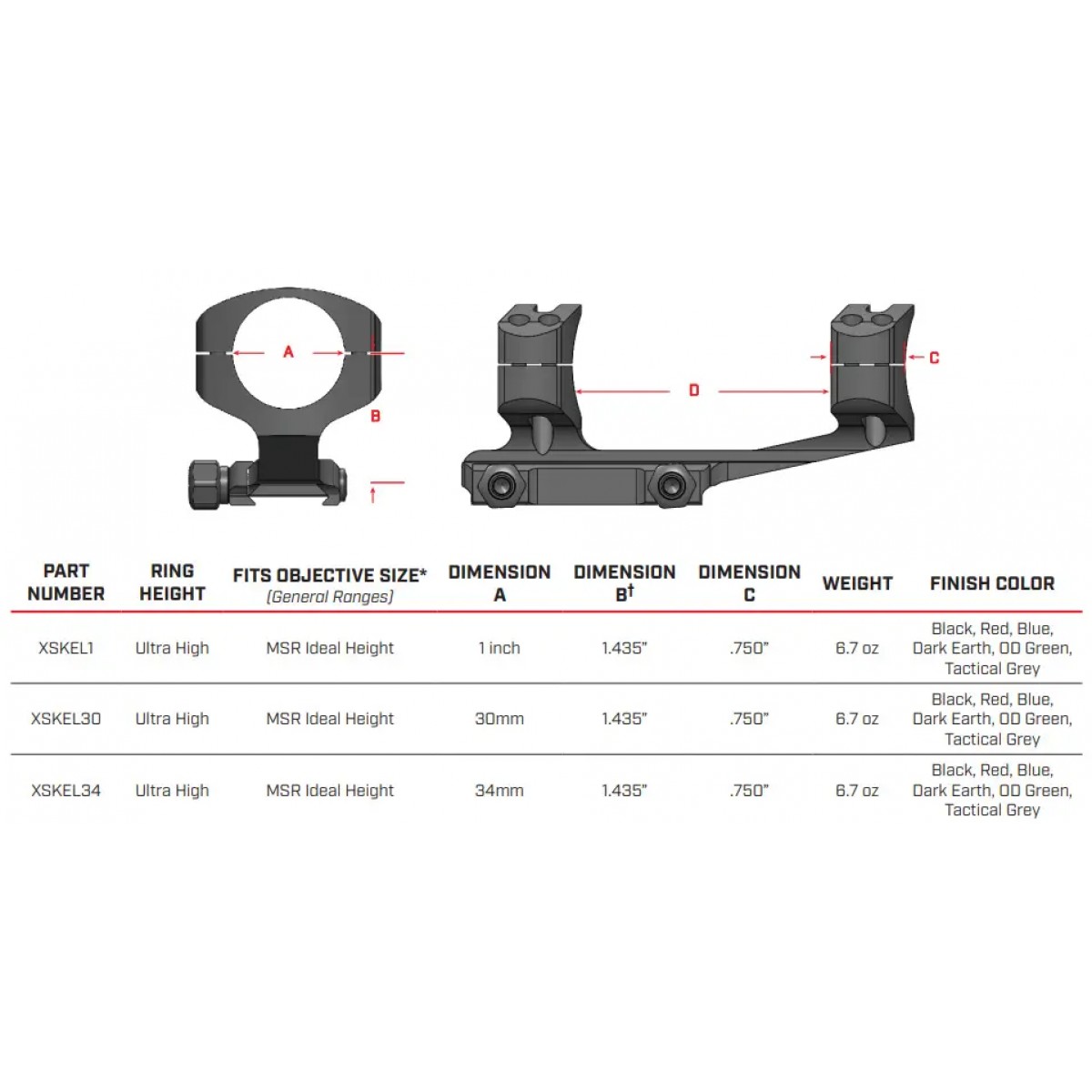 Warne X-SKEL Mount – тактичне кріплення-моноблок. Виготовлене з високоміцного і легкого алюмінієвого сплаву. Призначено для установки оптичних прицілів на планку Weaver/Picatinny. Передня частина кріплення виконана з виносом, що дозволяє встановити оптичний приціл як довгі, так і короткі планки. Висота підстави оптимально підійде для використання на гвинтівках типу M4/AR15.
