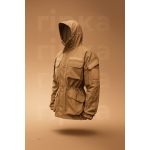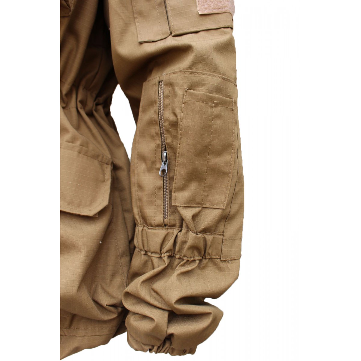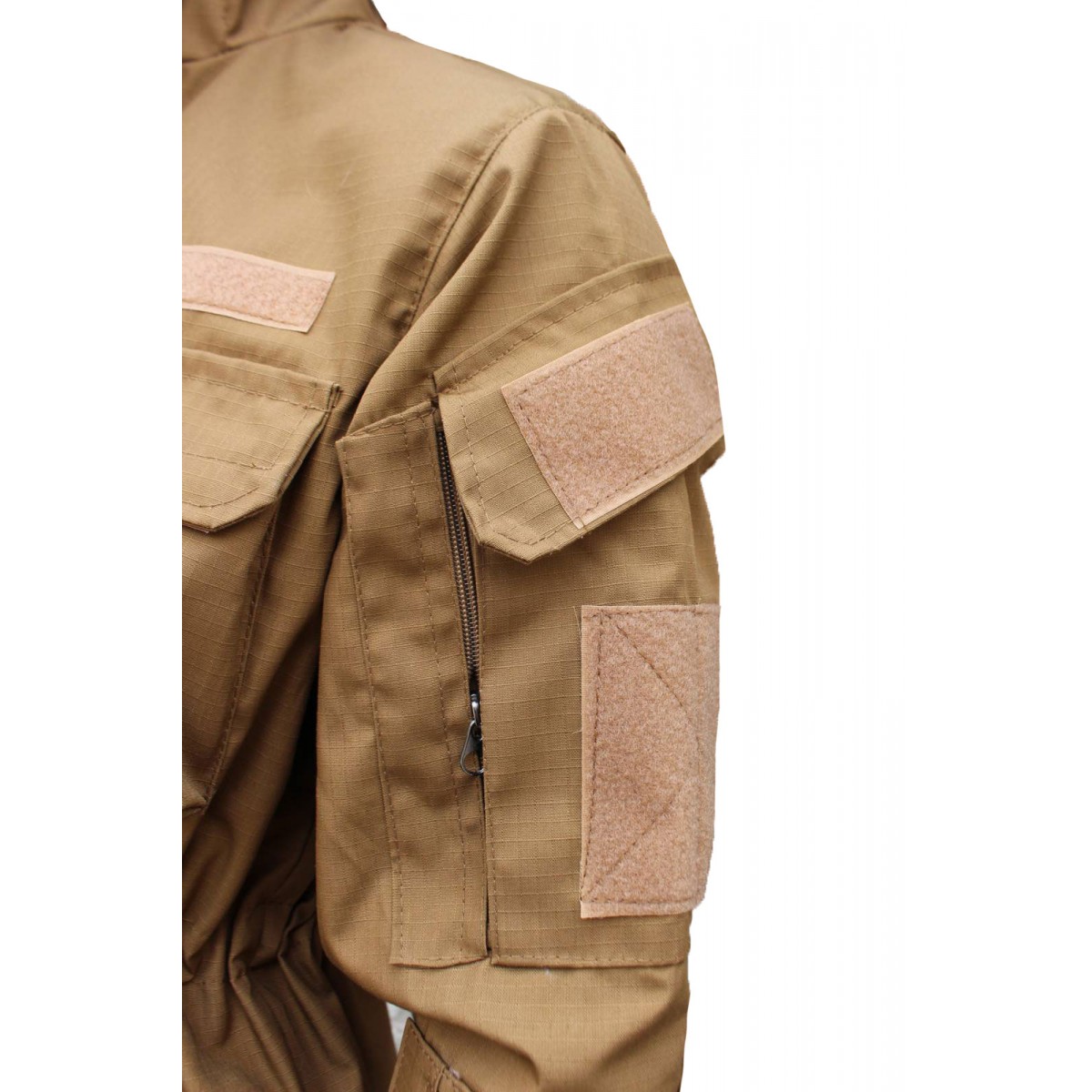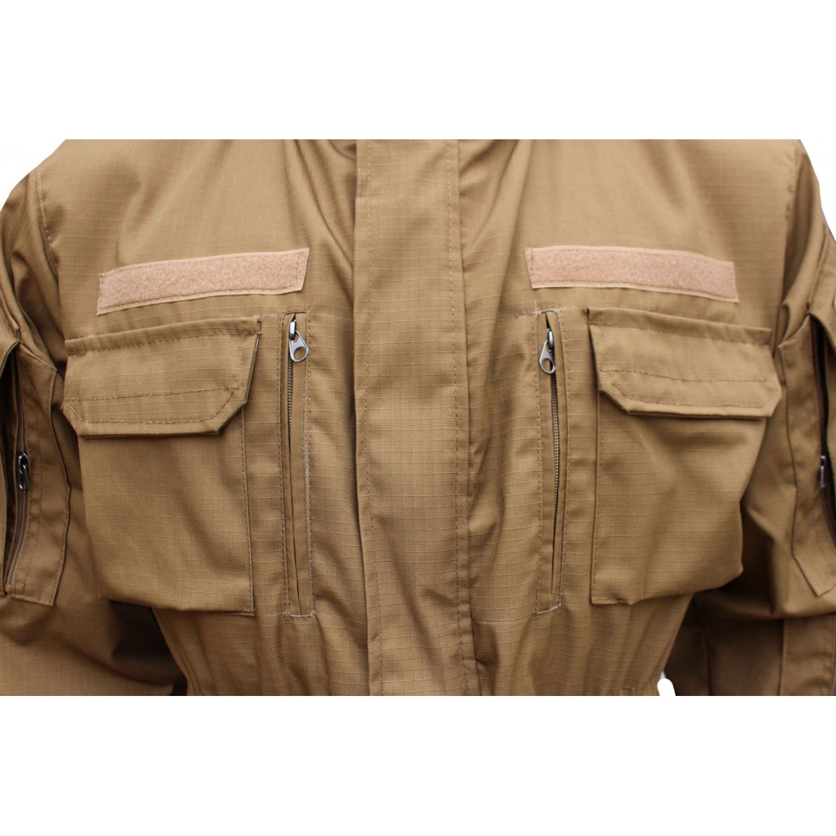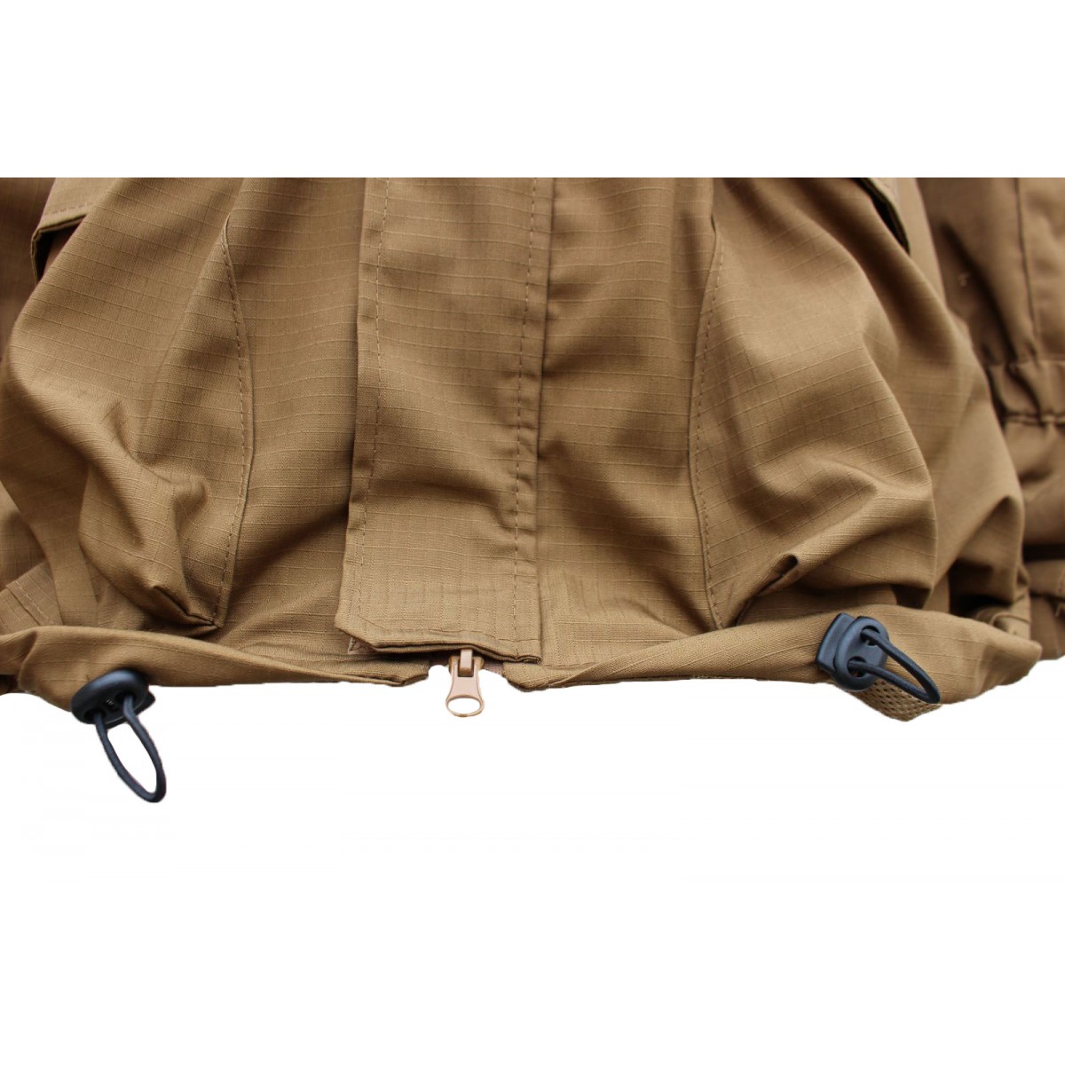 Матеріал: щільна ріп-стоп тканина з водовідштовхувальним просоченням. Посилені шви. Капюшон з утяжками. Блискавки з планкою від вологи. Панелі Velcro для шевронів. Кишені: нагрудні, накладні та на рукавах. Манжети з резинками. Регульована талія. Розміри 46-60. Кольори: олива, койот, MM-14, мультикам, хижак, чорний. Виробництво — Україна.