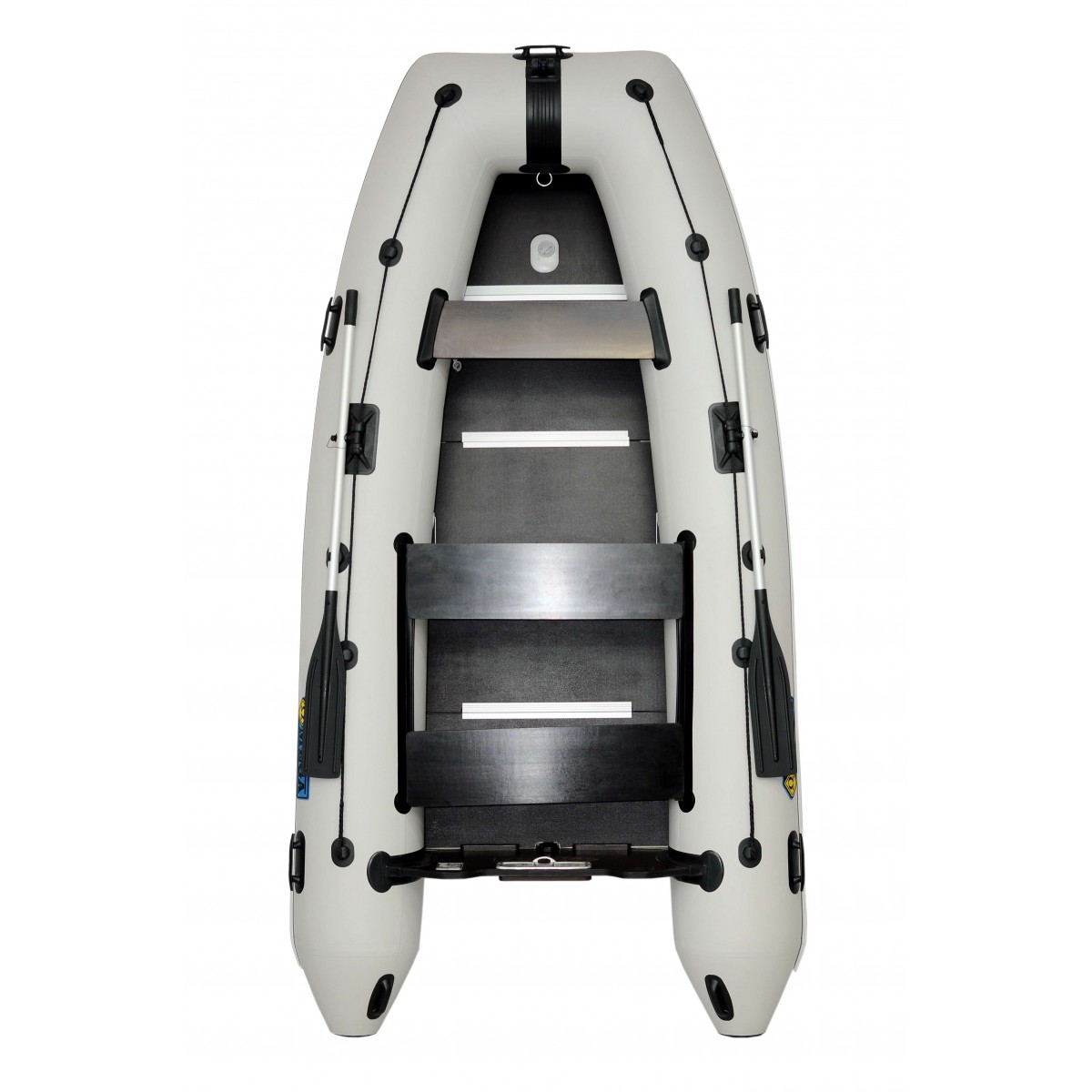 Кільової човен U-образного типу. Підлога з влодостойкой фанери, зібраний за допомогою алюмінієвих стрингерів. Страхувальний клапан, посилене кріплення транцем, посилені накладки низу човни, рим-ручка і якірний ролик на носі човна, леєр по периметру човна.Основні характеристики Човен Омега 360КU PFA (Lux)