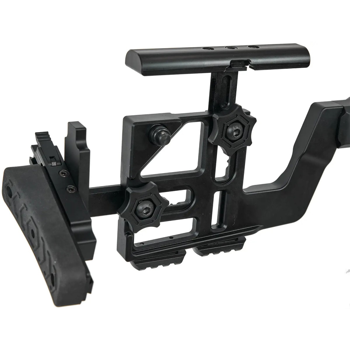 - Регулювання довжини приклада і висоти підщічника без використання інструментів. Підщічник виконаний з матеріалу Delrin з малою теплоємністю, а м’який потиличник має як регульовану висоту, так і регульований кут повороту відносно осі приклада.