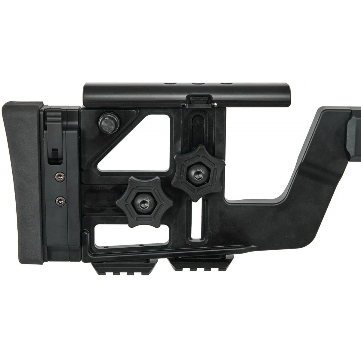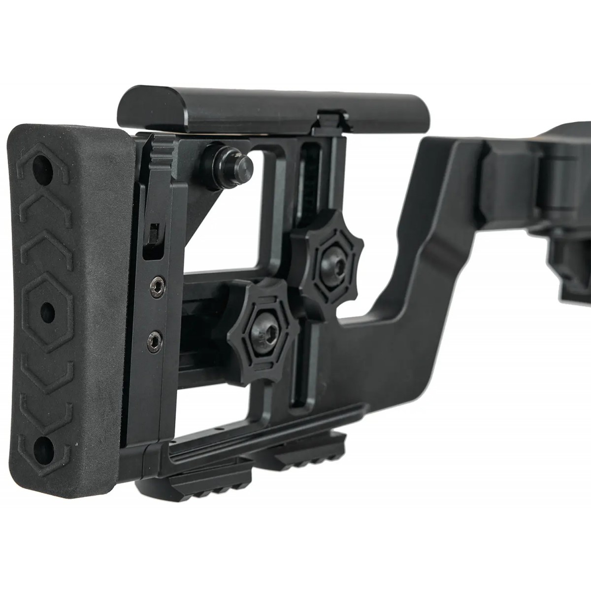 - Регулювання довжини приклада і висоти підщічника без використання інструментів. Підщічник виконаний з матеріалу Delrin з малою теплоємністю, а м’який потиличник має як регульовану висоту, так і регульований кут повороту відносно осі приклада.