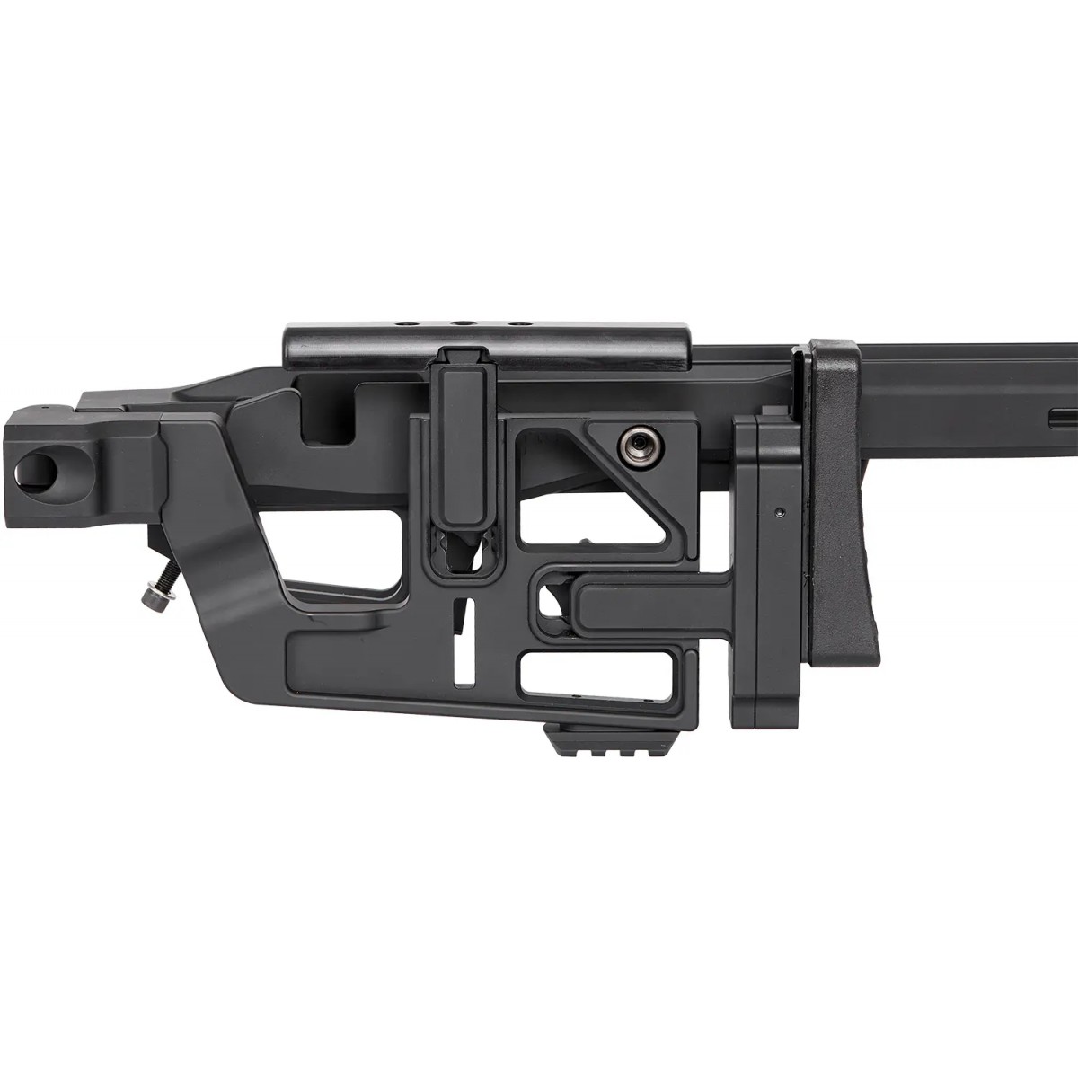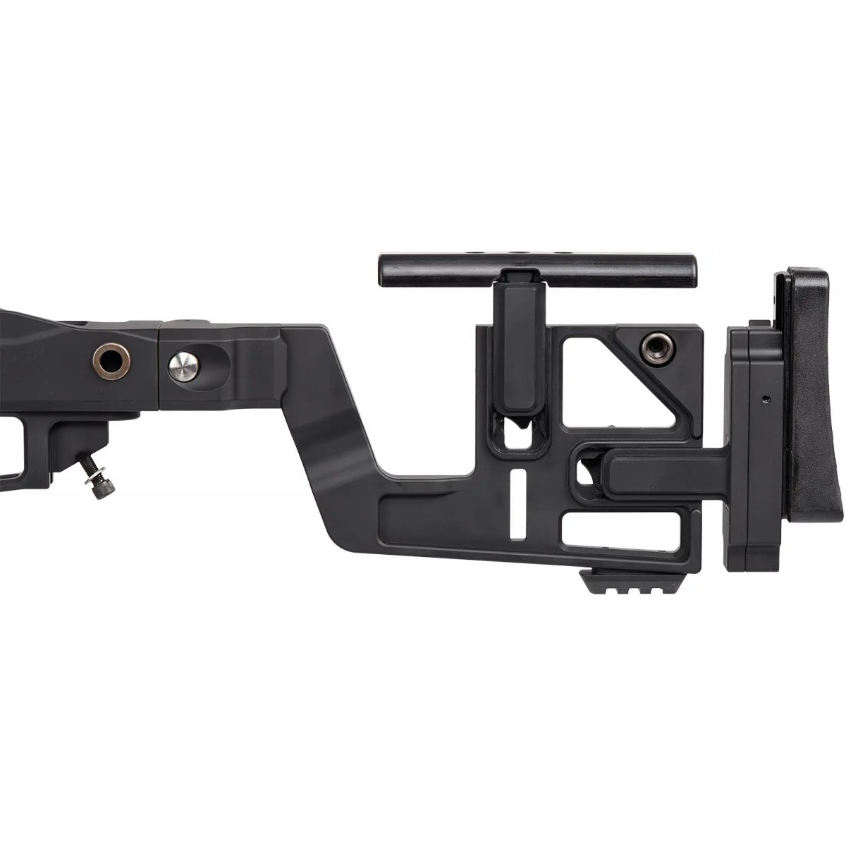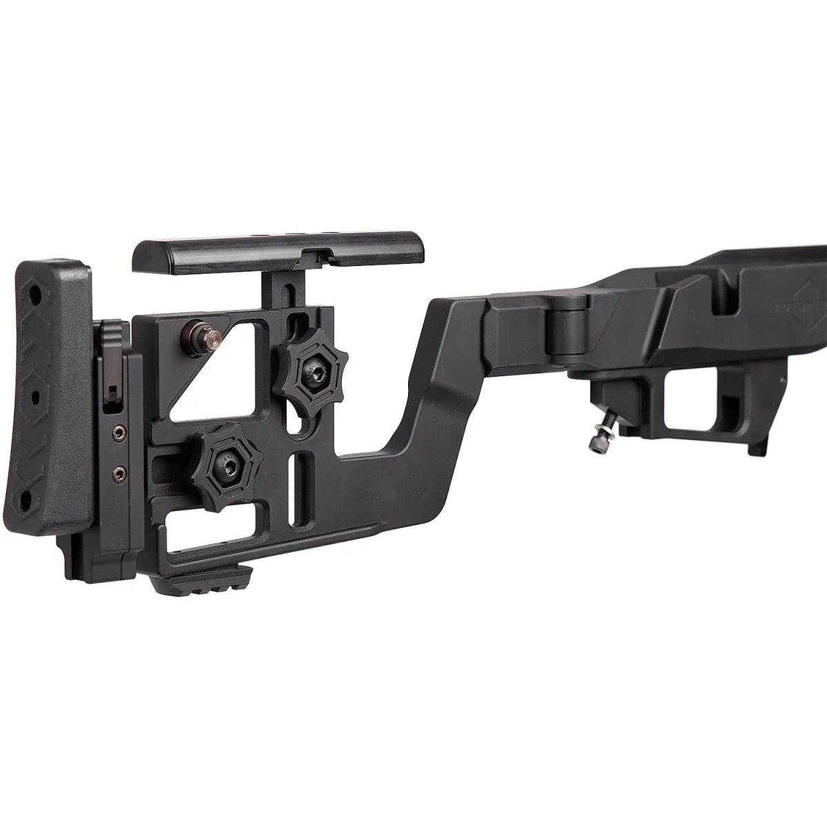 - Регулювання довжини приклада і висоти підщічника без використання інструментів. Підщічник виконаний з матеріалу Delrin з малою теплоємністю, а м’який потиличник має як регульовану висоту, так і регульований кут повороту відносно осі приклада.