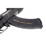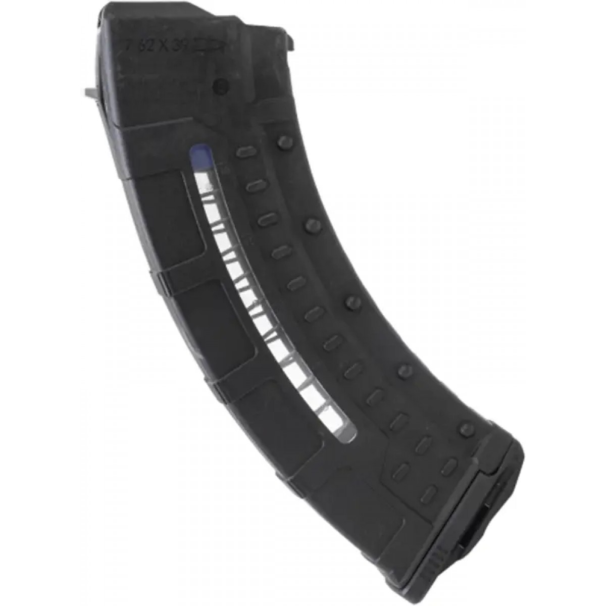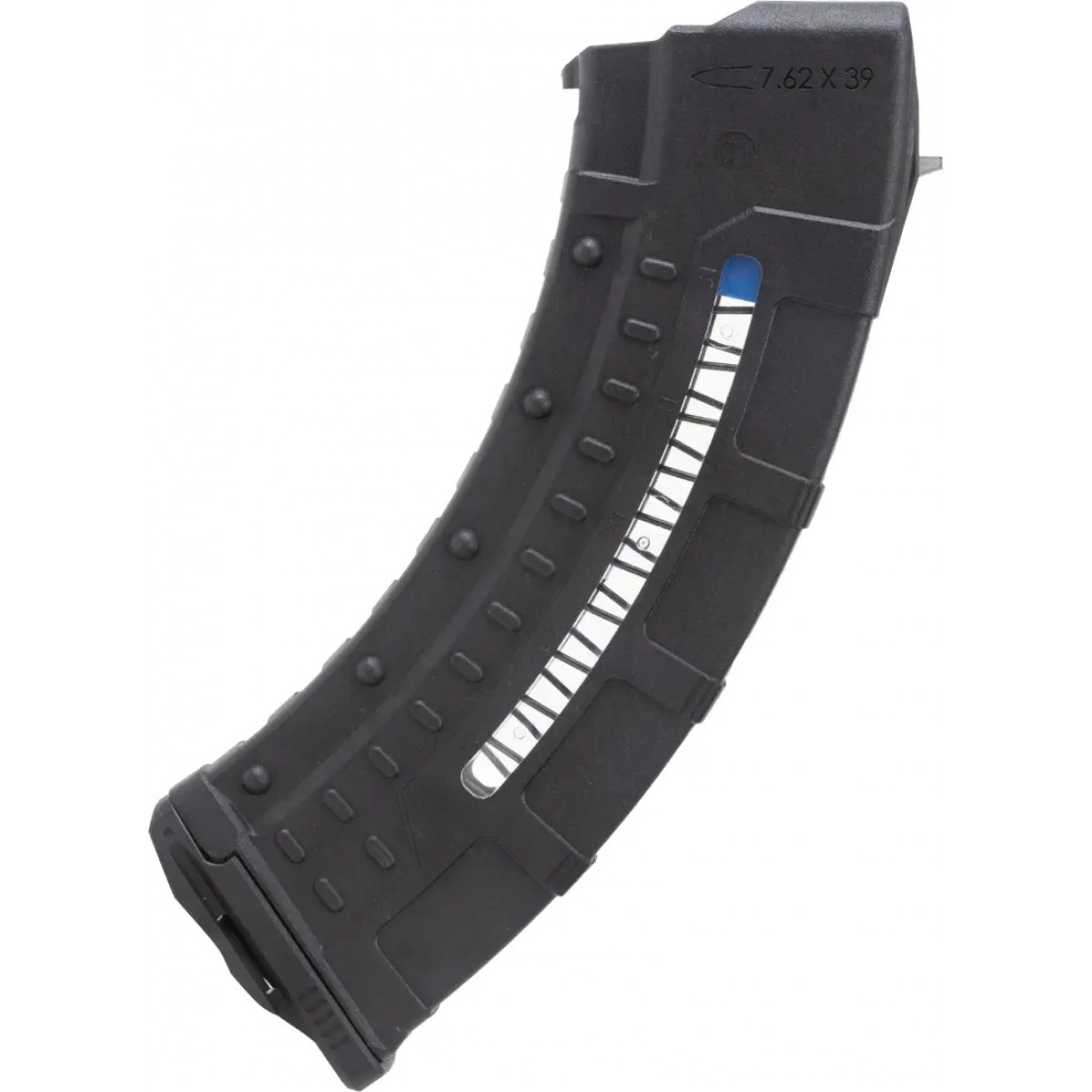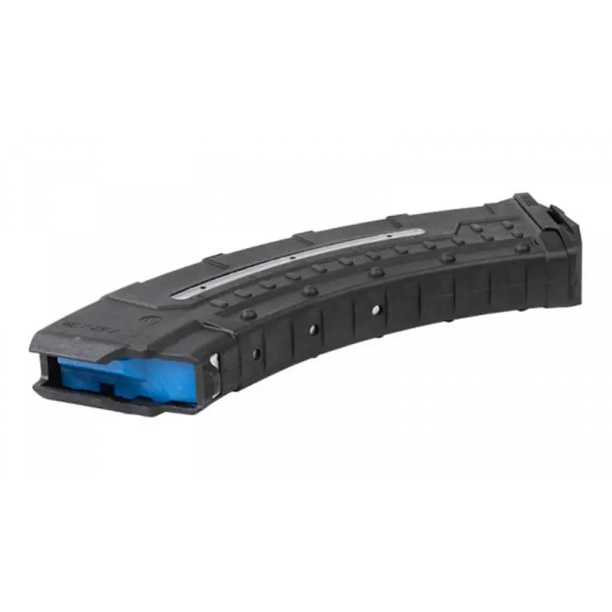 Магазин Leapers UTG AK/AKM розрахований на 30 патронів калібру 7,62х39. Виготовлений з міцного ударостійкого полімеру, армованого скловолокном. Подавач синього кольору, прозорі віконця по обидва боки магазина і маркування на корпусі дають змогу швидко визначити кількість патронів, що залишилися в магазині.