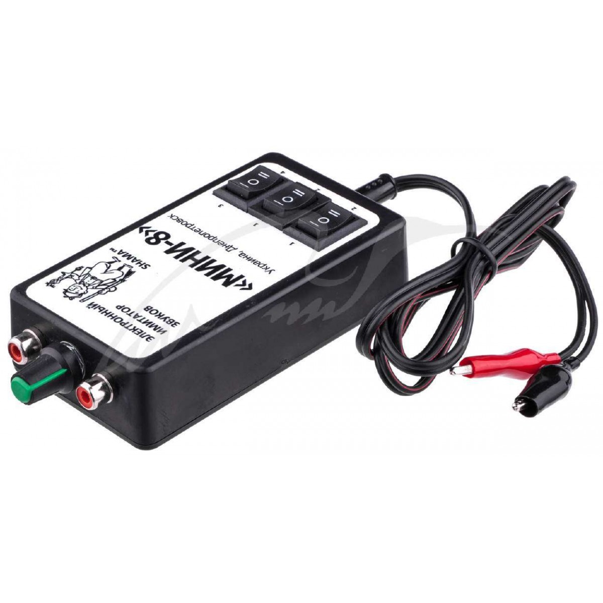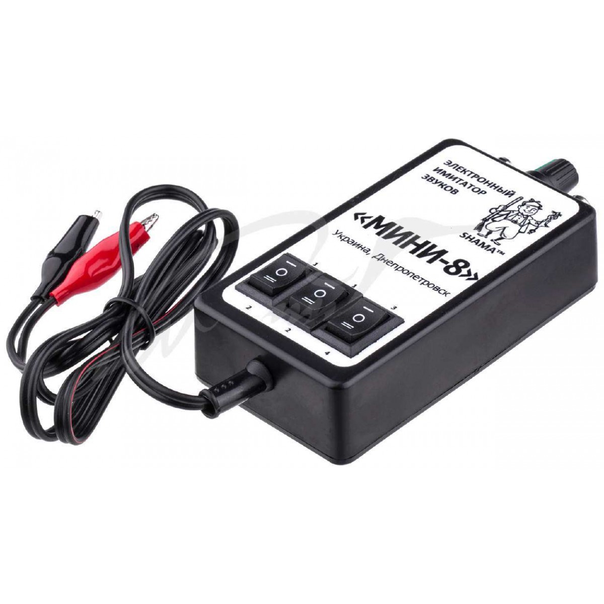 Електронний манок SHAMA "Міні-8" - нова модель манка, з двоканальним підсилювачем "D" класу. Даний підсилювач дуже економічний і застосовується в сучасній апаратурі. Харчування електронного манка "Міні-8" здійснюється від будь-якого джерела живлення від 6 до 12 вольт. На корпусі блоку управління розташовані три перемикача голосів. Перша кнопка відповідає за перемикання чіпів, а інші дві перемикають варіанти голосів. На першому чіпі електронного манка записані 4 голоси і на другому чіпі також записані 4 голоси. Таким чином, у сумі виходить 8 голосів тварин і птахів. У верхній частині корпусу блоку управління розташований регулятор гучності і два гнізда для підключення динаміків.