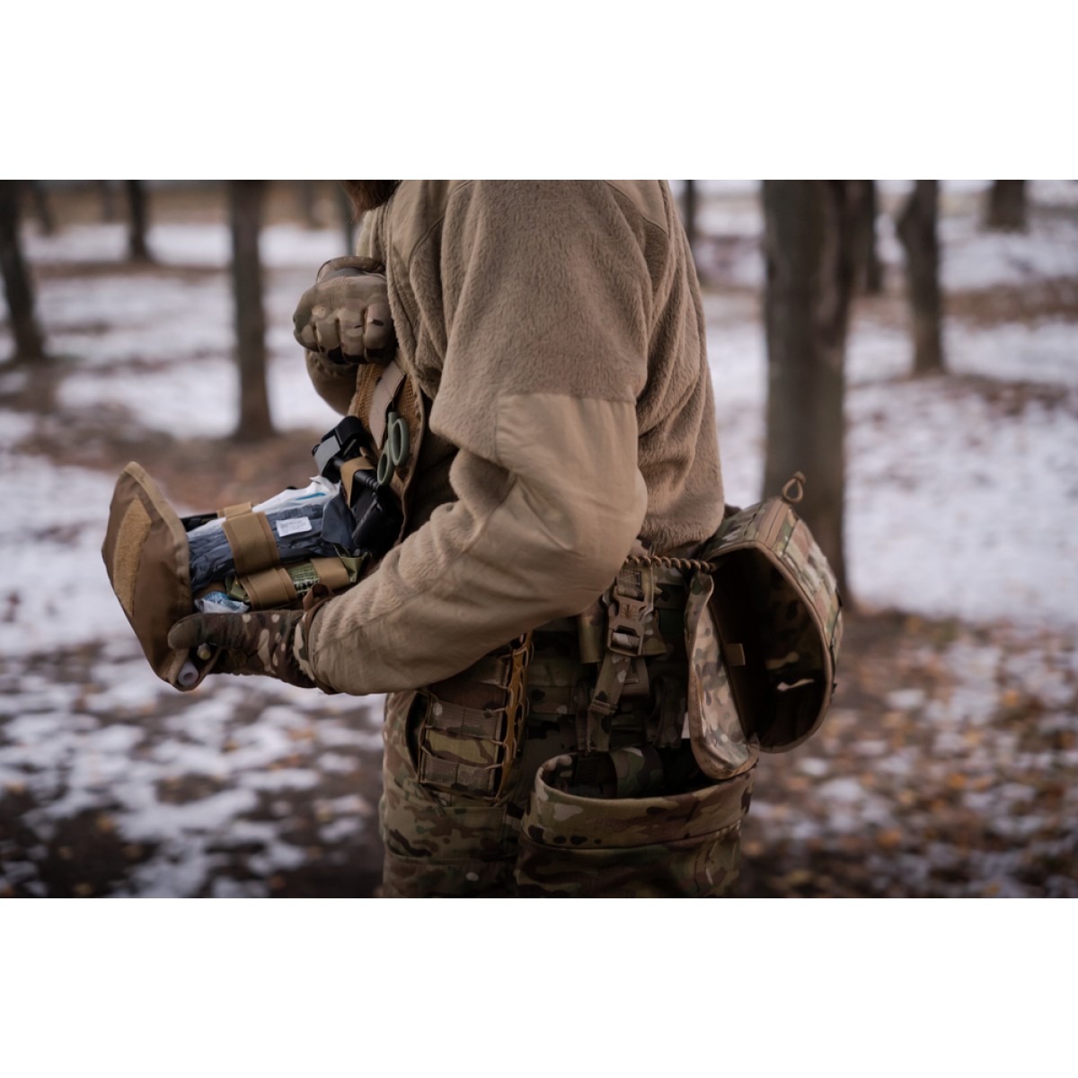 Індивідуальна тактична аптечка IFAK (Individual First Aid Kit) є стандартною частиною оснащення військових NATO. Вона має містити набір критично важливих медичних засобів та інструментів, необхідних для надання домедичної допомоги на полі бою при безпосередній загрозі життю. Медичний підсумок від «Балістика» створений за аналогом аптечок NATO, однак має збільшений розмір та функціонал. Особливості товару Аптечка дозволяє оптимально організувати внутрішній простір. Закрита конструкція запобігає потраплянню всередину бруду і водночас надає швидкий та зручний доступ до вмісту навіть в умовах сильного стресу. До інших властивостей виробу належать такі: Складається з двох частин: муфти та висувного модуля, який тримається всередині у згорненому стані. Модуль можна дістати як зліва, так і справа. Для цього потрібно смикнути одну зі строп, які пришиті до модуля з боків, за шворку зі зручним пластиковим наконечником у вигляді якоря. Бічні отвори муфти закриваються клапанами з двома велкро-смужками, між якими і проходить згадана стропа. Вона при цьому також кріпиться до клапана на липучку. Муфта має пластикову основу з двох окремих пластин, які допомагають їй тримати форму. Відсіки, в які вони поміщаються, застібаються на велкро, тож за бажання пластик можна вийняти і використовувати їх як звичайні кишені. Завдяки жорсткому каркасу та ковзкій тканині модуль легко виймається, навіть якщо підсумок розміщений на спині і модуль доводиться витягати з-під себе. Глибока зовнішня кишеня замикається на блискавку. Через неї можна дістатись до одного з відсіків для пластикової вставки. Муфта шнурується до спорядження на систему MOLLE. Зовні спереду на ній також нашиті чарунки, зокрема з липучкою, на які можна зафіксувати інші підсумки. Один ряд чарунок вміщений на верхній грані муфти. Через нього можна протягнути шворку для закріплення додаткових аксесуарів, які мають бути під рукою. Модуль для надійності прив’язаний до муфти на еластичну спіральну шворку, довжина якої у розтягнутому вигляді становить ~1,5 м. На протилежних кінцях всередині модуля вміщені дві сітчасті кишені на липучці (17×13 та 17×10 см), оснащені язичками для зручного відкриття. Простір між ними займають численні еластичні петлі для фіксації медичних засобів, а також одна відкрита кишеня (17×17 см). До верхнього краю пришитий невеликий (8×5 см) жорсткий клапан із липучкою, яким, власне, модуль і застібається. Крім того, за нього розгорнений модуль можна приліпити до велкро-панелі на плитоносці та отримати доступ одразу до всього наповнення. Зі зворотної сторони на клапані нашиті дві еластичні стрічки, поділені швами на шість відтинків, куди також можна встромити невеликий інвентар. Всі краї підсумка облямовані тасьмою, яка запобігає їхньому розтріпуванню та сприяє довговічності виробу. Технічні характеристики Зовнішній матеріал: Nylon 500D або Cordura 500D. Внутрішній матеріал: Oxford 340D, 2D-сітка. Фурнітура: блискавка (YKK), еластичні стрічки, резинка-спіраль («Фастекс.юа»), латунні люверси, наконечники «Якір», паракордові шворки. Липучка: Velcro. Розміри муфти: 20×20×9 см. Розміри висувного елемента (у розгорнутому вигляді): 20×57 см. Вага: 428 г. Внутрішній об’єм: 3,05 л.Відгуки про Підсумок для аптечки IFAK “Алатир” (Мультикам) ТМ Балістика