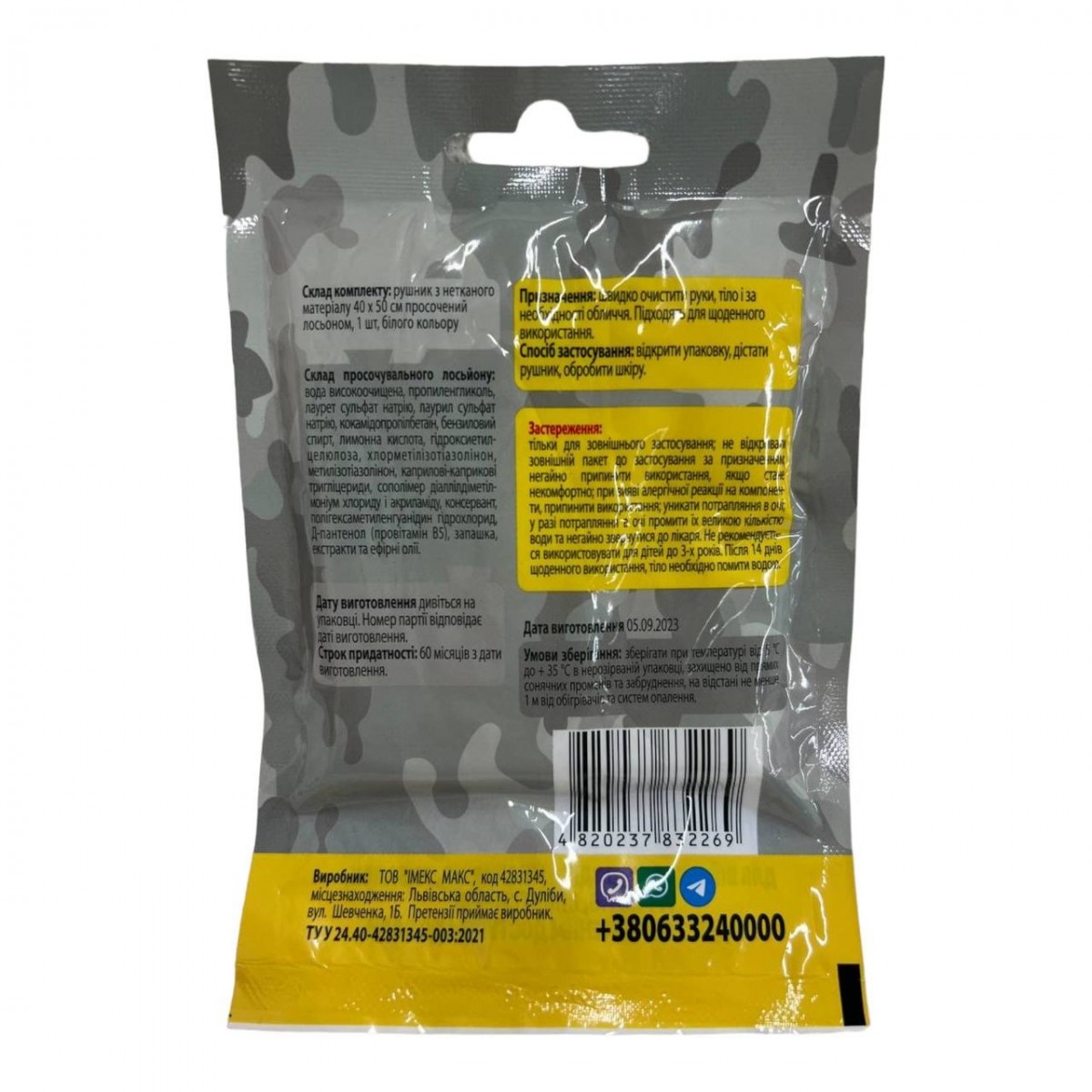 Вологий просочений рушник (50 х 30 см) в вакуумної упаковці призначений для миття та очищення шкіри в екстремальних умовах з обмеженим доступом до води.