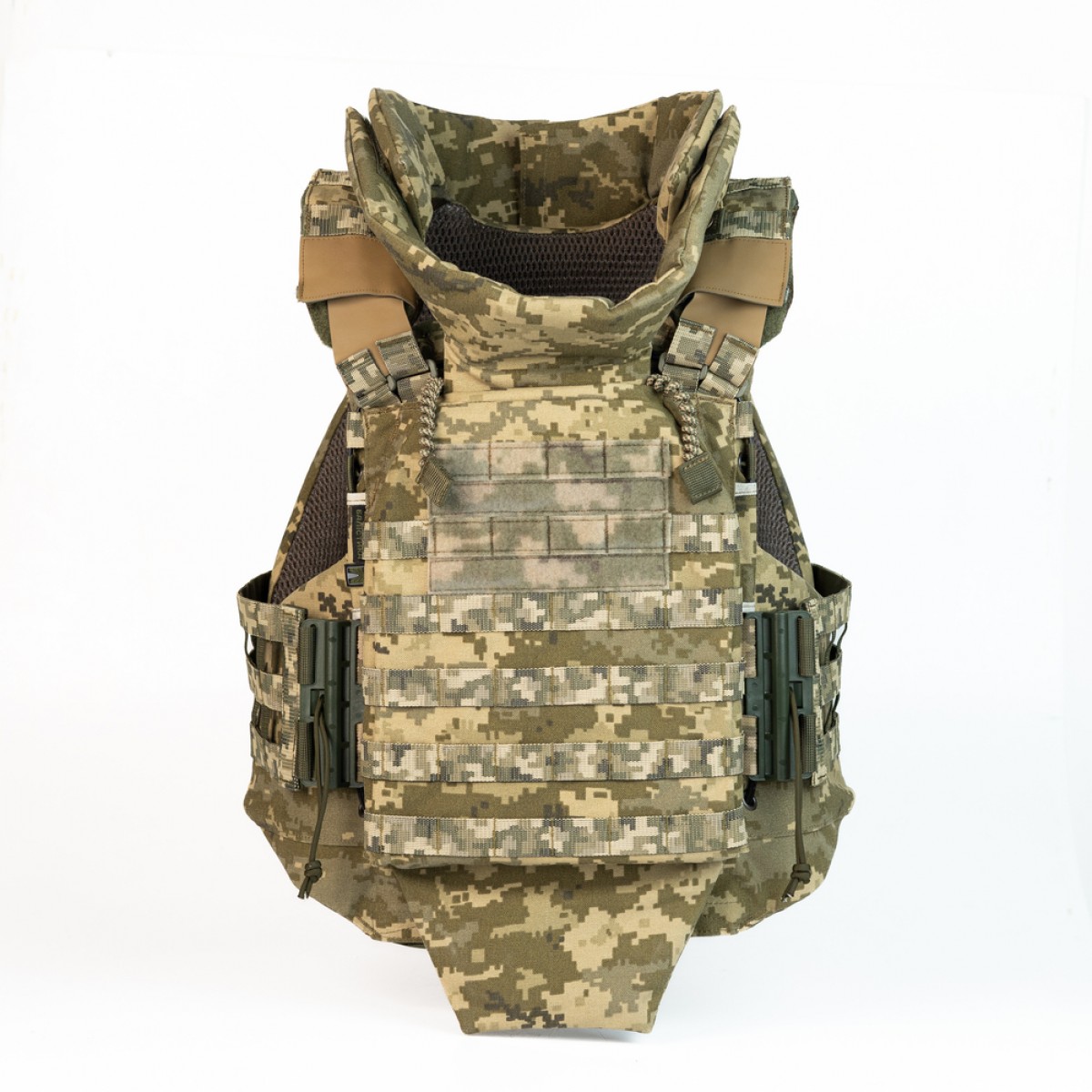 «Сармат» забезпечує ефективний захист проти уламків завдяки м’яким бронепакетам 1-го класу захисту згідно з ДСТУ 8782:2018. Вони виготовлені з НВМПЕ, який характеризується оптимальним співвідношенням міцності до ваги, чим перевершує показники матеріалів, що традиційно використовуються у виробництві бронезахисту. Полегшений бронежилет складається з трьох основних частин – протиуламкової «Майки», коміра та пахово-абдомінального модуля. Рухомі та від’єднувані елементи дозволяють налаштувати бронежилет відповідно до ситуації та надають необхідний рівень захисту без зайвого навантаження. Особливості товару Балістичний захист Бронежилет оснащений м’якою бронею 1-го класу захисту загальною площею 52 дм2 та вагою 4,7 кг (без бронеплит). Матеріал для бронепакету – надвисокомолекулярний поліетилен (НВМПЕ) – виробляється ізраїльською компанією FMS. Бронепакет 1-го класу захисту нашого виробництва з НВМПЕ під час випробувань витримує постріли з автоматичного пістолета Стєчкіна з відстані 5 м. Має заперешкодне ураження до 22 мм (у середньому 15 мм і менше). Також бронепакет не змінює балістичних властивостей у разі намокання на відміну від кевлару (параараміду). Протокол відстрілу 1-й клас захисту згідно з ДСТУ (STANAG V-50 – 614,5 м/с) Протокол відстрілу «Сармат» 1-й клас згідно з ДСТУ Бронеплити Окрім відсіків для м’яких бронепакетів, «Сармат» оснащений фронтальною та тильною кишенями для бронеплит. Вони розраховані на комплектацію стандартними пластинами розміром 25×30 см зі скошеними верхніми кутами товщиною до 30 мм. Також сумісні з пластинами SAPI M, ESAPI M. У нашому інтернет-магазині ви можете придбати сталеві плити відповідного розміру та перетворити «Сармат» на справжній армійський бронежилет: Плита 3-го класу з бронесталі 25×30 см. Плита 4-го класу з бронесталі 25×30 см. Плита 4-го класу полегшена з бронесталі 25×30 см. Матеріали Бронежилет виготовлений з міцного, зносостійкого нейлону, що здатен витримувати значні навантаження впродовж тривалого часу. Вся внутрішня частина вистелена 3D-сіткою, яка сприяє активній циркуляції повітря і запобігає перегріванню. У бронежилеті використовується якісна нейлонова липучка велкро виробництва Alfatex. Пластикова фурнітура теж виготовляється з нейлону. Точність виконання системи MOLLE у бронежилеті забезпечена завдяки високоточному комп’ютеризованому обладнанню. Лямки Ергономічні плечові лямки також виконані з використанням 3D-сітки, яка, окрім всього, сприяє рівномірному розподілу ваги на плечах. Передня частина лямок виготовлена з гіполону, надзвичайно міцного матеріалу. Вона фіксується на липучку у клапані, на якому також нашита вставка із гіполону, у яку зручно вкладати приклад зброї при стрільбі. Водночас за допомогою велкро регулюється і довжина лямок відповідно до зросту військового (до 2 м). А зверху на них вміщено кілька чарунок MOLLE для закріплення невеликих підсумків або лямок перекидного штурмового рюкзака. Модуль захисту шиї Комір призначений для захисту шиї та ключиць. Він має зручні кріплення до лямок бронежилета та чарунок MOLLE на фронтальній плиті. Передня і задня частини фіксуються до бронежилета на велкро, а до лямок – на хлястики з кнопкою. Щоб провітрити шию та отримати більшу свободу рухів, пере́д можна відстібнути і покласти на груди. Поздовжній розріз на задній частині робить можли